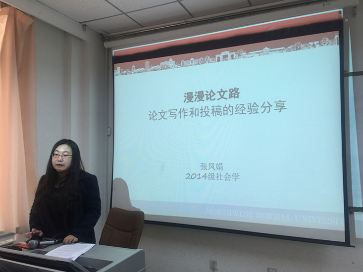 2016年11月11日下午,水果派2014级社会学专业硕士研究生、国家奖学金获得者张凤娟和2014级社会工作专业硕士研究生石金萍,在10号楼D区503教室分别作了题为《漫漫论文论》、《社工之魅力:以生命影响生命—农村残疾青少年服务经历分享》的学术报告。水果派副院长李怀教授参加,王琪瑛副教授和刘永明副教授做点评嘉宾。水果派 全体研究生参加了此次学术活动。学术报告由2015级行政管理专业研究生、水果派 研究生会主席丁岩主持。
