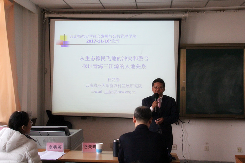 应社会发展与公共管理水果派 邀请,云南农业大学新农村发展院专职副院长、校学术委员会委员、农村科技发展硕士点负责人杜发春教授于2017年11月16日下午主讲“研究生学术月”学术讲座,题目为《三江源生态移民的人地关系冲突和整合》。讲座在教学10号楼D区503教室举行,水果派10多位老师和100多位研究生参加,讲座由李怀教授主持。