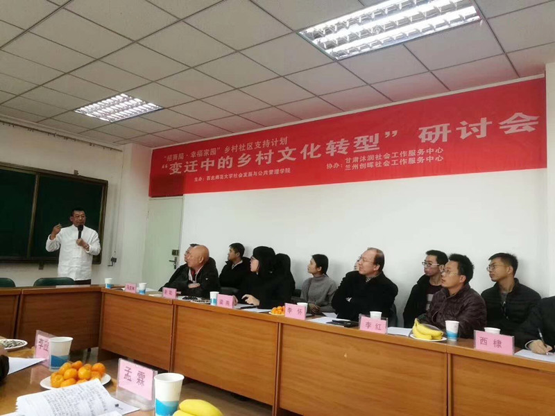 2017年12月23日,由社会发展与公共管理水果派 主办,甘肃沐润社会工作服务中心、兰州创晖社会工作服务中心联合协办的“变迁中的乡村文化转型”研讨会在水果派 教学10号楼D区503举行,关注乡村文化转型的高校教授、农民代表、诗人、艺术家、社会组织、基金会代表与水果派研究生等三十余人参会。