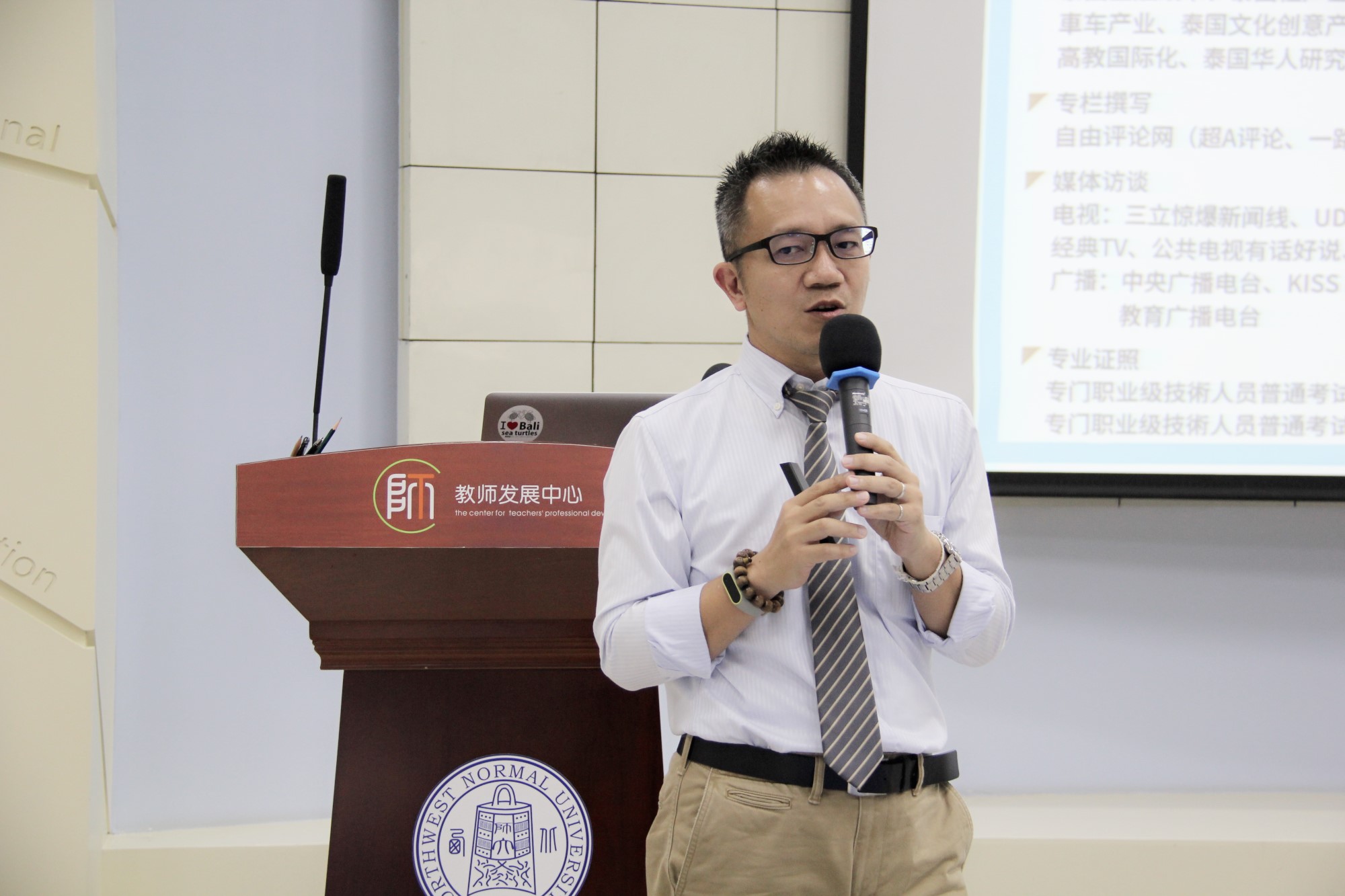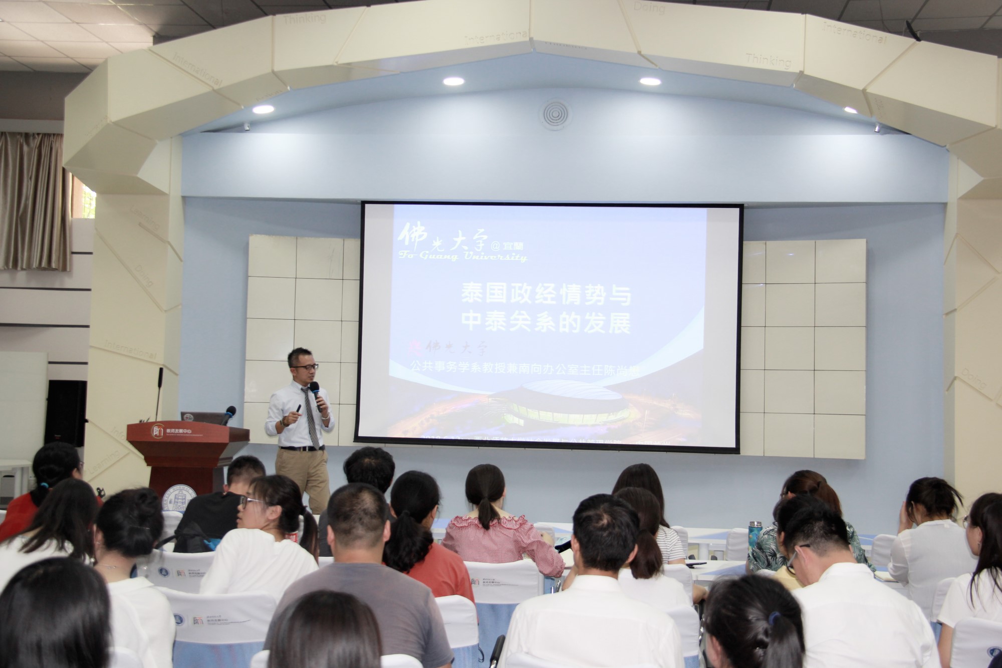 陈尚懋教授首先介绍了佛光大学公共事务学系的教学目标,三大专业学程(文官能力养成学程、国际与两岸事务学程以及公共关系与政治行销学程)以及对口的实习地点和实习内容,旨在培养具有公共服务社会实践、组织管理政策分析、公共关系危机管理、两岸及全球事务研析素养和能力的学生。接着,陈教授从泰国的危机、泰国的转机、泰国的重要和泰国的未来等方面着重分析了近20多年来泰国政治与经济形势的发展变化与影响因素。最后,陈教授论证了中泰两国世代友好关系的变迁与发展状况。
