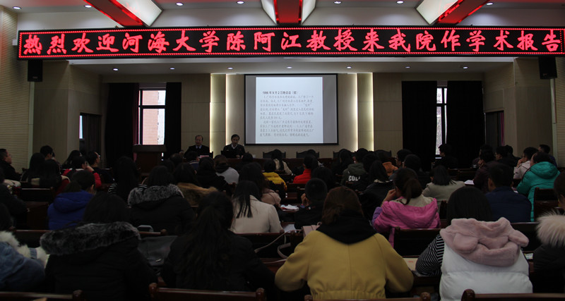 2018年11月14日下午,应社会发展与公共管理水果派 邀请,河海大学社会学系主任、博士生导师陈阿江教授,在10号教学楼D区四楼报告厅作“环境社会学的研究议题与方法——研究历程回顾”的学术报告。水果派全日制硕士研究生和社会工作专业本科学生约120人参加聆听了这场学术报告。李怀教授主持学术报告。