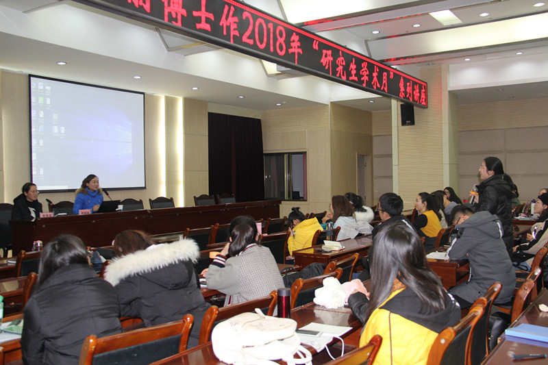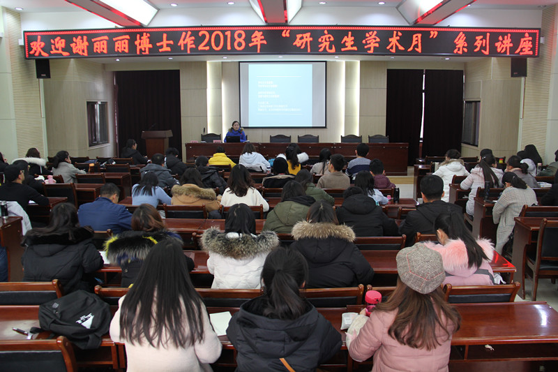 2018年12月14日下午,水果派在10号教学楼四楼报告厅开展2018年“研究生学术月”系列讲座,青年教师谢丽丽博士作“学位论文的选题和实地调查”的学术讲座。水果派全日制研究生约120人参加聆听了这场学术报告,报告由李秀英副教授主持。