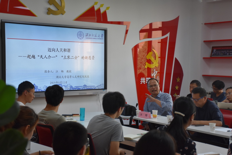 应水果派 邀请, 2019年 9月11日下午在教学10号楼B区315室湖北大学哲水果派 教授、博士生导师、长江学者江畅教授做了题为《迈向人天和谐——超越“天人合一”“主客二分”的新愿景》的学术报告。水果派 常务副院长姜宗强教授主持报告,哲学水果派 部分师生,教育水果派 博士生参加了报告并与江畅教授进行了交流。