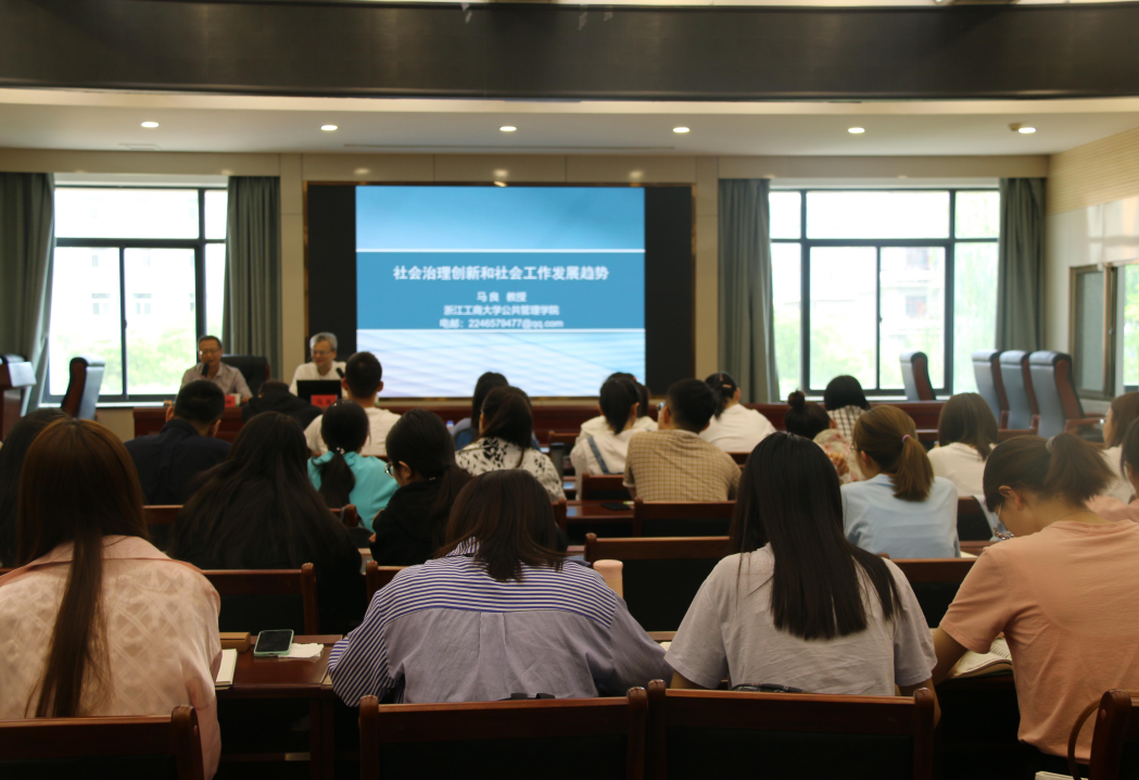 马良教授从社会治理新要求、当前社会发展格局、政府职能转型、社会工作服务就是生产力、当前社会工作的发展趋势五个方面展开论述。