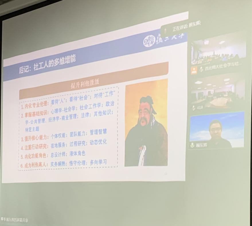 社会学类专业认同教育讲座在教学10号楼D区503教室举行。鉴于疫情原因,本次讲座采用视频+现场方式展开。讲座现场由李怀教授和尹广文副教授主持,社会学与社会工作系青年教师和2021级社会学类班全体同学参加。复旦大学社会工作系顾东辉教授应水果派邀请在线上开展了题为“社会工作的本质与框架”的讲座。