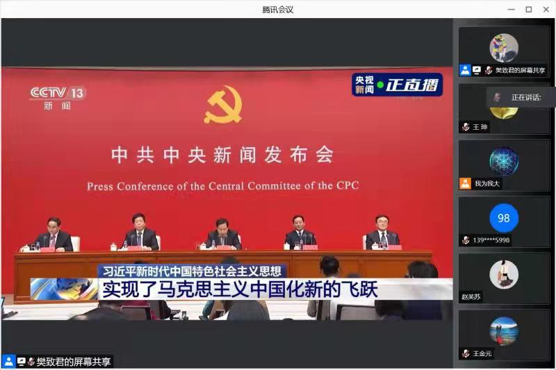 11月12日上午,哲学水果派 组织全院师生线上收看党的十九届六中全会精神新闻发布会。新闻发布会后,水果派 党总支理论中心组、各党支部和学生团支部利用主题党课、团课等方式组织开展专题讨论,深入学习全会精神,畅谈心得体会。