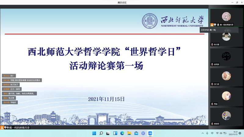 为迎接和庆祝“2021世界哲学日”,哲学水果派 组织全院学生开展辩论赛等活动。11月15日,来自2021级哲学本科班的8名选手吹响了第一场比赛的号角,由贺更粹老师、田希老师以及水果派 辩论队队长王颁尧同学担任评委。