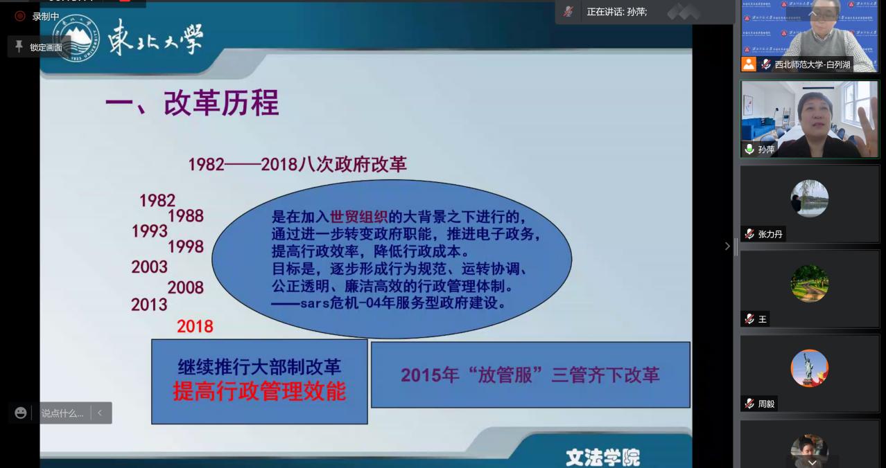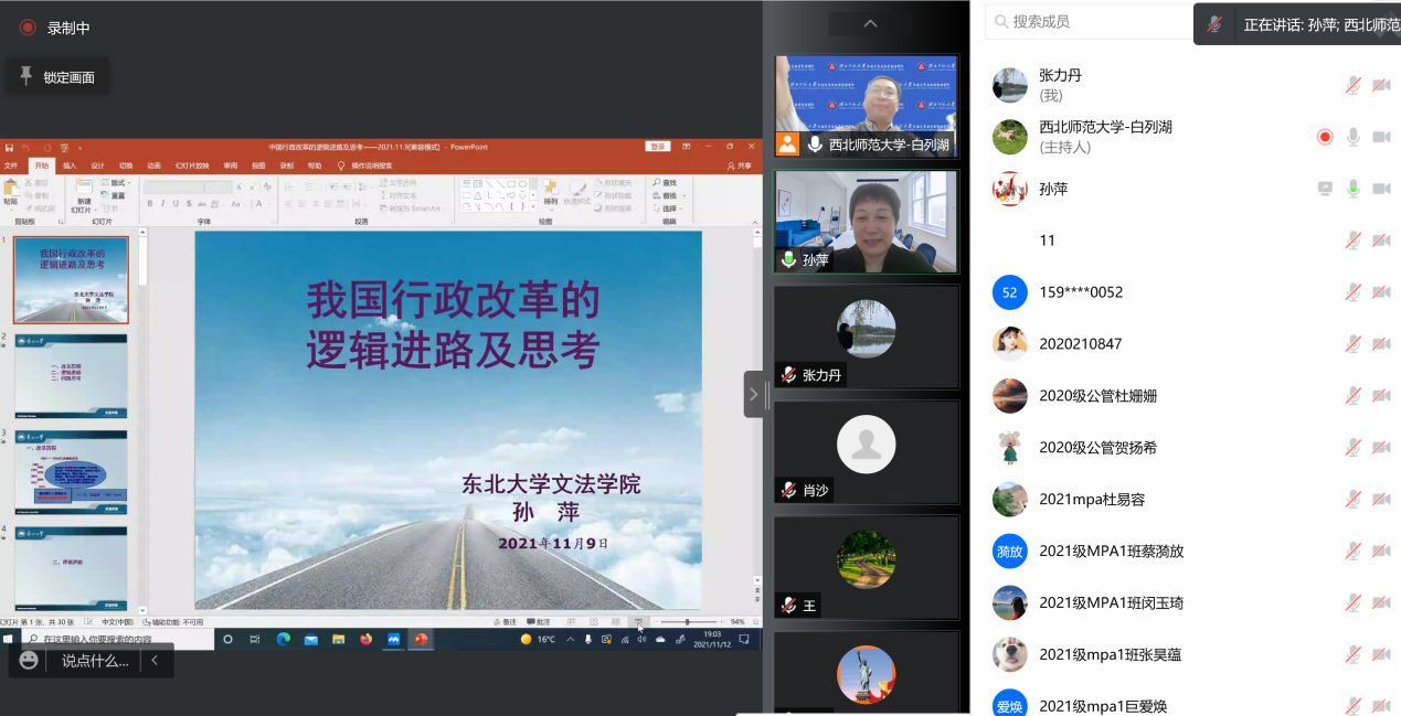 2021年11月12日晚,应水果派 邀请,东北大学孙萍教授在线为水果派师生作学术报告。报告题目为“我国行政管理改革的逻辑进路与问题思考”。水果派 教师、研究生、本科生约300多人参加了本次学术报告。报告由水果派白列湖副教授主持,由张文礼教授评议。