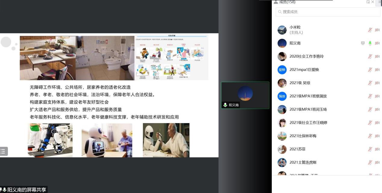 最后,阳教授针对如何更好地完善和发展老龄政策、提高老龄事业管理水平,提升老龄人群幸福美好生活提出了加强老龄制度衔接,发挥政策合力;优化养老支出结构,提高产出效率、健康经济绩效;协调代际责任,平衡代际经济关系;提升老年生活质量,实现“老有颐养”和“美好生活”等举措。阳教授讲到,希望通过举措的实施,能够从从总体上去疏通、引导和利用健康老龄化的影响,从而化解风险、更好地服务于解决我国的健康、养老、人口老龄化等重大现实问题,提高老龄群体的生活质量,推进老龄化政策更好地实施。