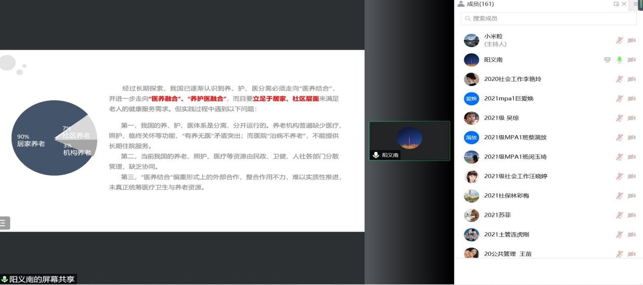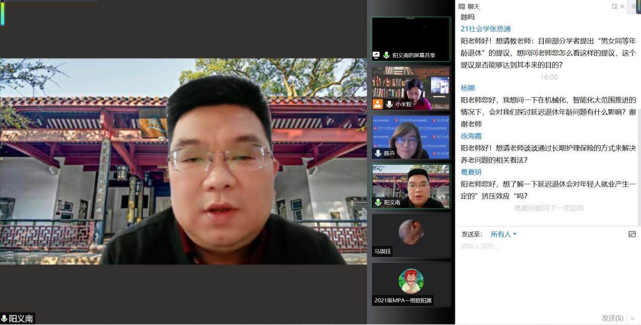 2021年11月18日下午,湖南大学博士生导师阳义南教授在腾讯会议上为水果派众师生带来一场名为“中国老龄政策研究的十个认识”的主题讲座。社会发展与公共管理水果派 师生百余人在线学习。本次讲座由陈卉副教授主持,由戈银庆教授担任讲座评议人。