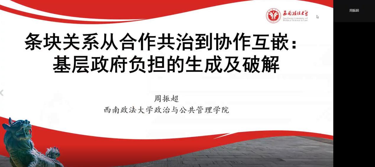 2021年11月24日晚,应水果派邀请,西南政法大学政治与公共管理水果派 周振超教授在腾讯会议上为水果派 社会发展与公共管理水果派 师生带来了题为“条块关系,从合作共治到协作互嵌——基层政府负担的生成及破解”的学术讲座。本次讲座主持人为刘磊副教授,与谈人为张文礼教授,校内外近200名师生参加了本次线上讲座。
