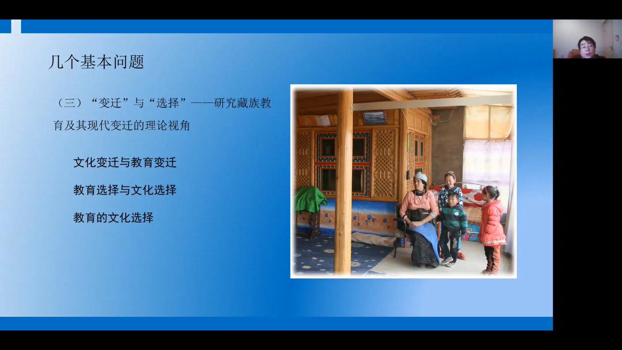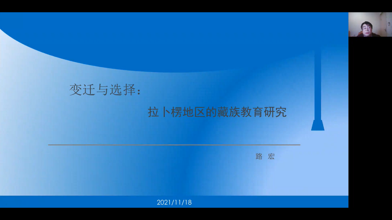 讲座开始,路宏老师首先以“传统或现代?”、“现代化与教育现代化”、“变迁与选择”等几个基本问题为切入点,探讨了“对拉卜楞藏族教育的田野思考”、“新时代背景下藏族教育发展的分析”、“研究藏族教育及其现代变迁的理论视角”等几个点。接下来,路宏老讲述了藏族文化教育的历史实践及藏区学校教育的文化选择与历史变迁,认为应该从民族教育变迁看藏族教育的文化内涵和从不同学校教育实践对其进行教育观察。之后,路宏老师从家庭教育的传统维度:“实践维度”和 “价值维度”,论述了拉卜楞藏族家庭教育的方式和形态。最后,通过对拉卜楞地区“传统教育与社区教育的选择”、“寺院教育的时代转型”等两个问题的阐述。路宏老师给出了“和合共生,守正出新”的拉卜楞藏区教育发展的可行途径。