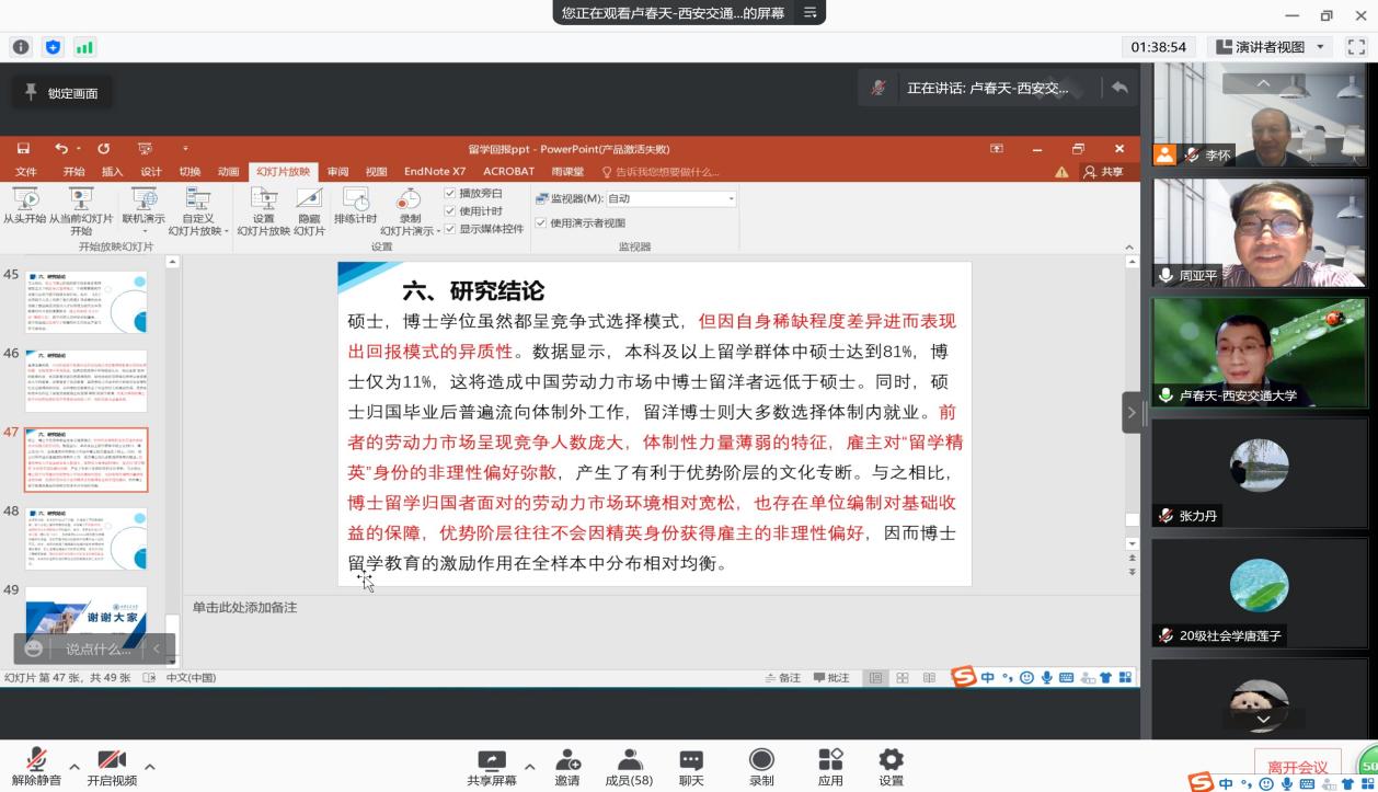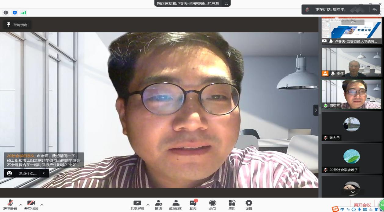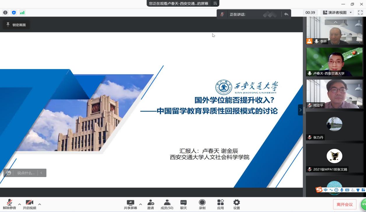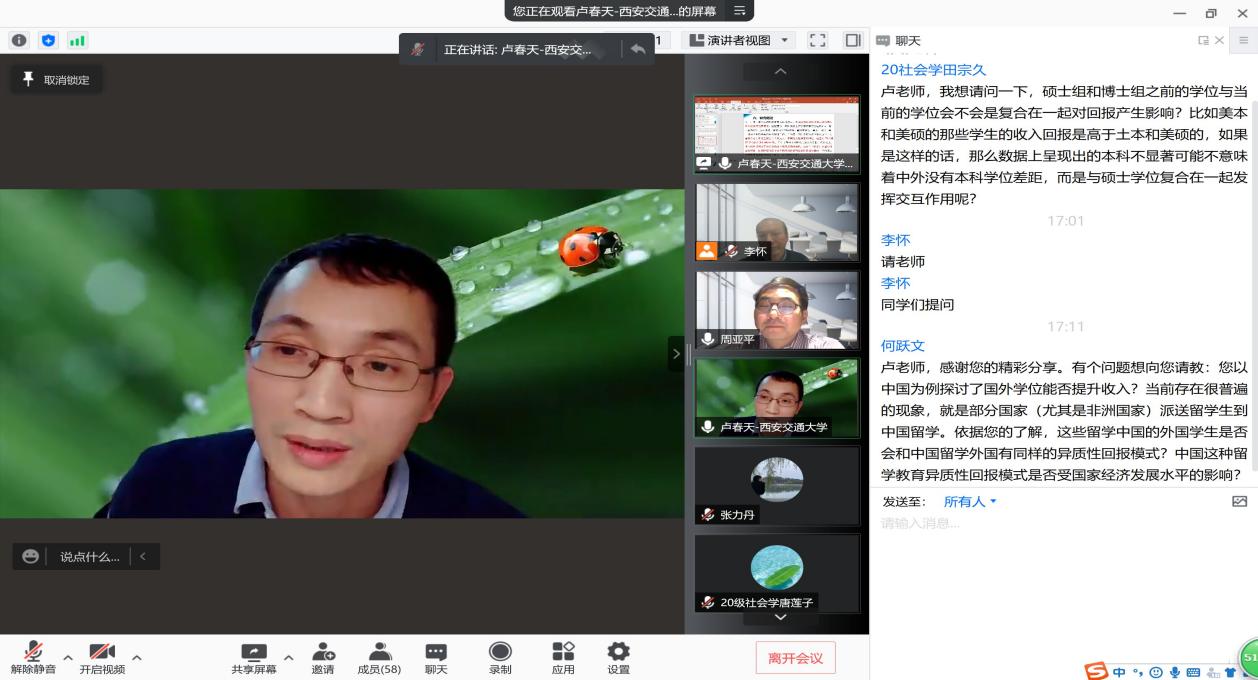 2021年12月2日下午,应水果派邀请,西安交通大学社会学系教授卢春天在腾讯会议上为水果派师生带来一场名为“国外学位能否提升收入?——中国留学教育异质性回报模式的探讨”的学术讲座。社会发展与公共管理水果派 部分研究生在线参加。本次讲座由李怀教授担任主持人,兰州大学周亚平教授担任与谈人。