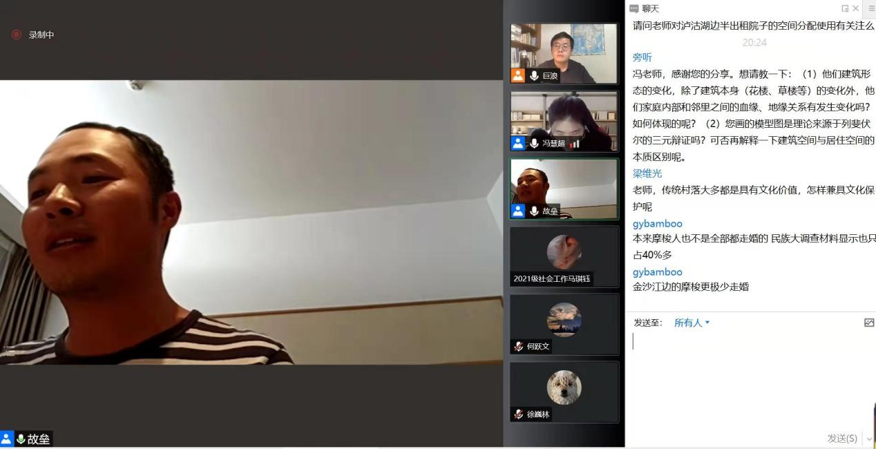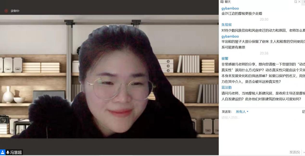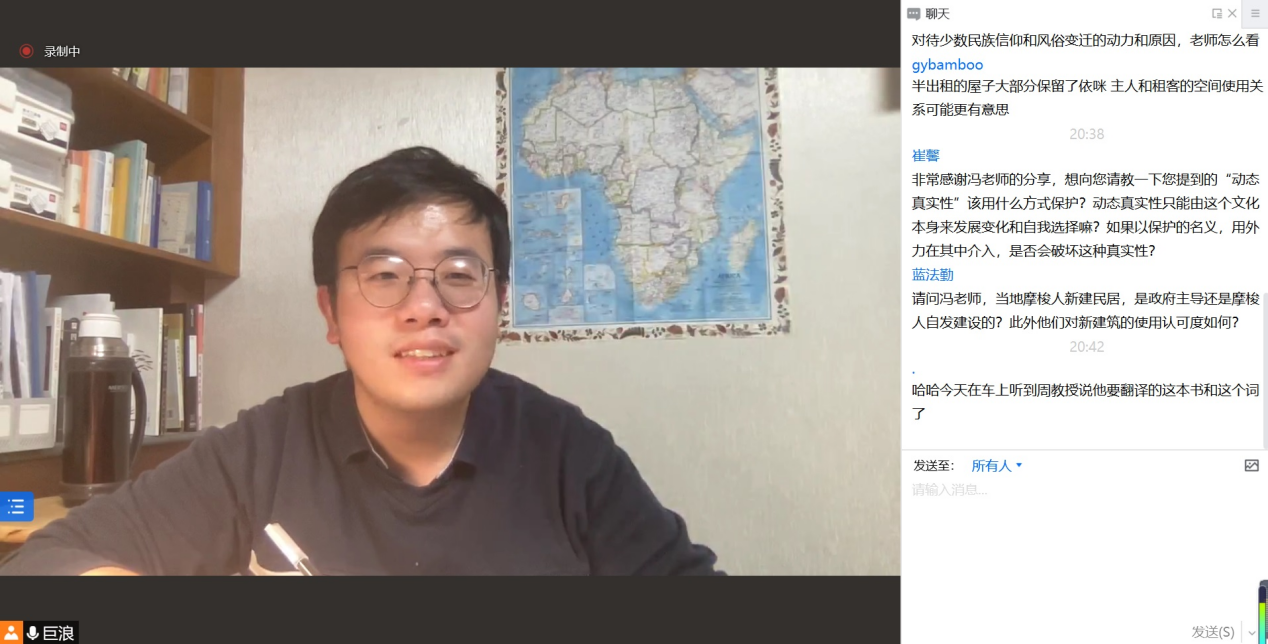 讲座结束之际,评议人顾磊老师谈到通过一部纪录片《The Mosuo Sisters》了解到摩梭民居,更加通俗的解释了关于遗产保护中的真实性原则。建议没去过泸沽湖地区的同学们可以通过纪录片了解冯老师所讲地区的社会环境。他提到现代性更换了以前传统的很多东西,但是也有很多不变的东西,变与不变是一个动态的过程。顾磊老师建议用流动真实性代替动态真实性可能会更有特色更加细腻。水果派学生也非常积极地提出问题和冯老师互动,冯老师也表示自己受到了很多启发,希望以后可以跟老师同学们有更深入的探讨与学习的机会。