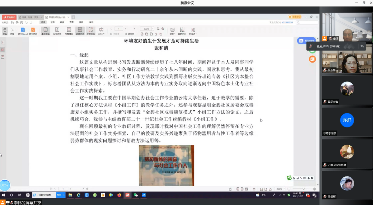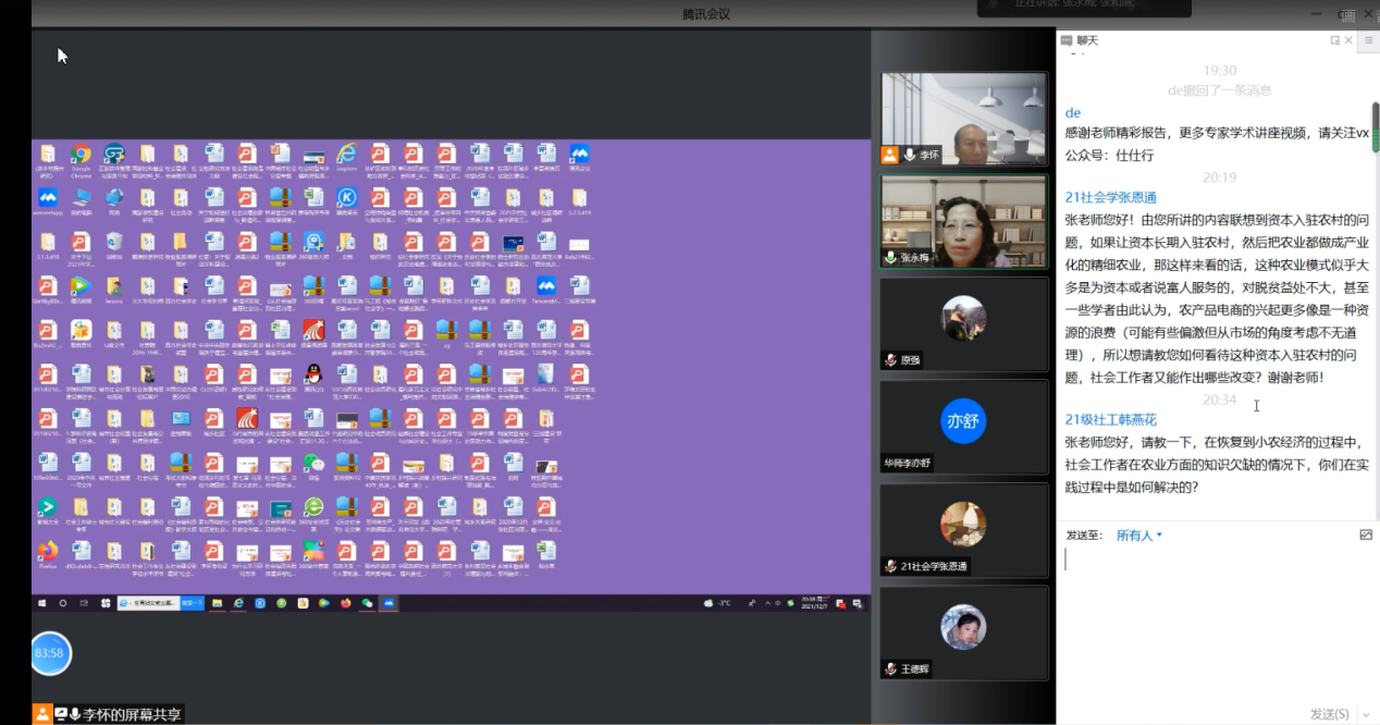 讲座尾声,与谈人张永梅教授分享了自己的体会并提出问题,水果派 老师和同学们积极主动地向张老师提出自己的疑问,张老师进行了细致地详尽解答。李怀老师对张老师的精彩分享表示感谢,同时对张老师的分享内容作了简要总结,他表示社会工作者在运用实务和理论过程中,忽视了马克思主义关于生态系统的理论,以后要在这方面多加关注与探索。李老师也借此机会向张老师再次发出邀请,希望张老师日后能亲临我校,再为同学们带来精彩的学术报告。