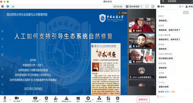 12月9日晚,应水果派邀请,中国地质大学白中科教授通过腾讯会议为全院师生带来题为“人工如何支持引导生态系统自然修复”的学术讲座。本次讲座由刘春芳教授担任主持人,甘肃农业大学陈英教授担任与谈人。