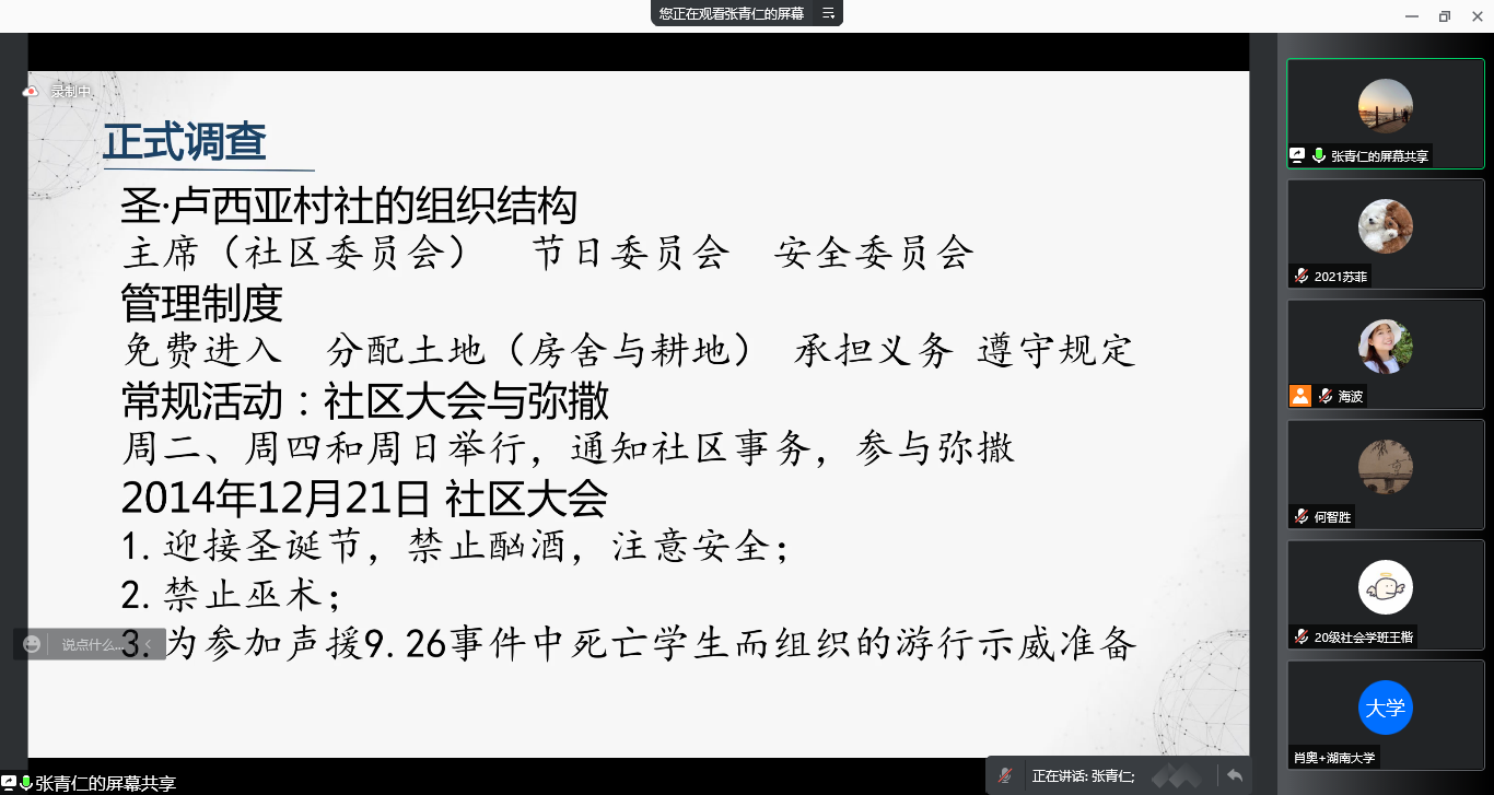 其次,张青仁老师详细介绍了其在墨西哥恰帕斯田野调查的缘起、过程、经验与反思。对于将墨西哥恰帕斯作为田野点的选择,张老师认为那是一种看似偶然的必然。恰帕斯州位于墨西哥东南部,其州府是图斯特拉-古铁雷斯(Tuxtla Gutlerrez),而张老师的田野点位于州府西部的圣克里斯托瓦尔-德拉斯卡萨斯(San Cristobal de las Casas)。在介绍完田野点的具体地理位置和前期语言学习情况后,张老师详细的讲述了自己预调研、确定田野点和选择报道人的过程:2014年2月,张老师到达墨西哥恰帕斯州府,并对其周边城市进行了预调查,以初步熟悉当地社会、文化环境。2014年8月至10月,张老师圣到克里斯托瓦尔-德拉斯卡萨斯进行正式调查,通过每日走访,他熟悉了城市的历史、格局、建立了自己的朋友圈,确定了研究主体与田野对象,同时也在实践中锻炼了西班牙语。2014年10月,张老师关注到当地人建立起来的自治社区——圣卢西亚。经过与社区负责人沟通和参与社区组织的活动,张老师获得社区成员的接纳,顺利入住社区开始了进一步田野调查工。张老师在介绍田野调查基本情况的同时对圣卢西亚自治社区的组织结构、管理制度、合法化诉求、经济生活和参与社会运动、选举活动等方面的内容进行了详尽而生动的阐释。