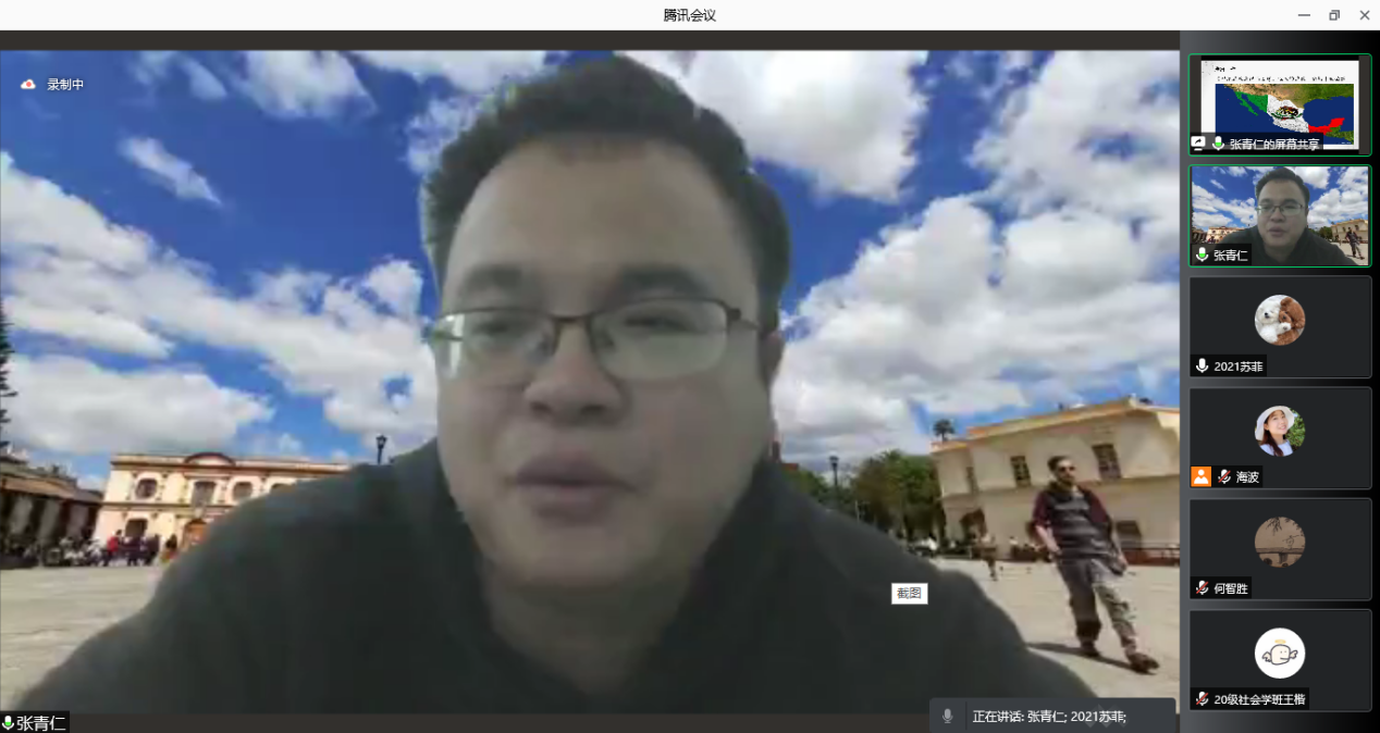 2021年12月11日晚,社会发展与公共管理水果派 邀请中央民族大学民族学与社会学水果派 副教授,国家民委区域国别基地“拉丁美洲社会文化中心”主任张青仁老师开展了一场题为“墨西哥恰帕斯印第安社区田野调查的经验与反思”的线上讲座。此次讲座由水果派包海波老师主持,李秀英副教授担任与谈人,近百名校内外师生参与。讲座正式开始前,包海波老师简要的对人类学研究路径的独特之处以及到海外去做民族志研究的时代需求做了背景介绍。