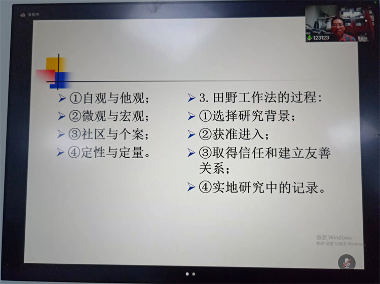 其次,祁进玉教授分享了他现阶段对鄂伦春族的田野调查进展情况,并重点以其博士论文“不同情景中的群体认同意识—基于三个土族社区的人类学对比研究”为例,对田野调查的具体工作进行了讲解说明和指导分析,祁教授分享了自己对西北甘、青地区几个土族聚居农村(互助、民和、同仁等地)和两个城市(西宁、北京)土族散杂社区实地调查研究的经验和心得体会。同学们学会了如何选择田野点、如何熟悉田野点,如何使用个案访谈和调查问卷,如何进行主位和客位的观察研究,如何进行共时性与历时性的对比等。