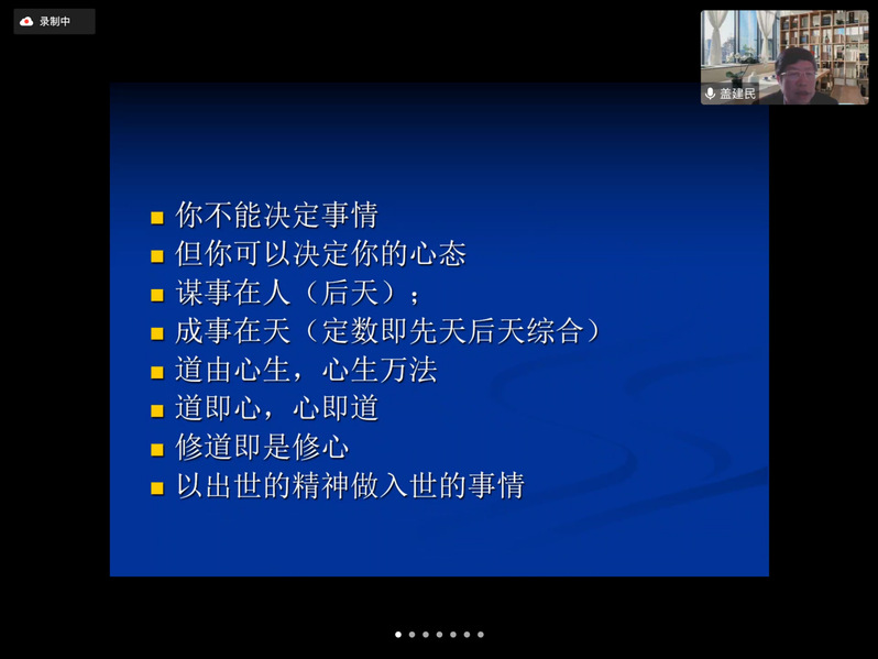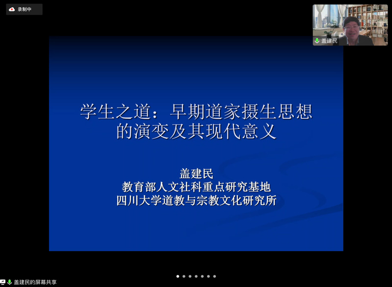 11月20日,作为学校百廿校庆学术活动和水果派 “世界哲学日”系列讲座之一,四川大学道教与宗教文化研究所所长、博士生导师盖建民教授应邀通过腾讯会议为全校师生作了题为《学生之道:道家摄生思想的早期流变及其现代意义》的学术报告,哲学水果派 谢增虎教授主持报告会。水果派 师生及校内外哲学爱好者百余人参加报告会。