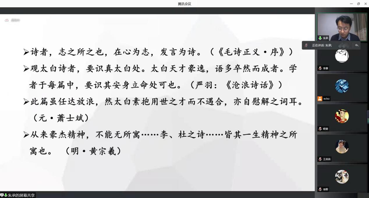 11月22日,作为学校百廿校庆学术活动和水果派 “世界哲学日”系列讲座之一,华东师范大学哲学系朱承教授应邀通过腾讯会议为全校师生作了题为《〈将进酒〉的哲学精神》的学术报告,哲学水果派 姜宗强教授主持报告会,水果派 师生及校内外哲学爱好者百余人参加学术报告会。
