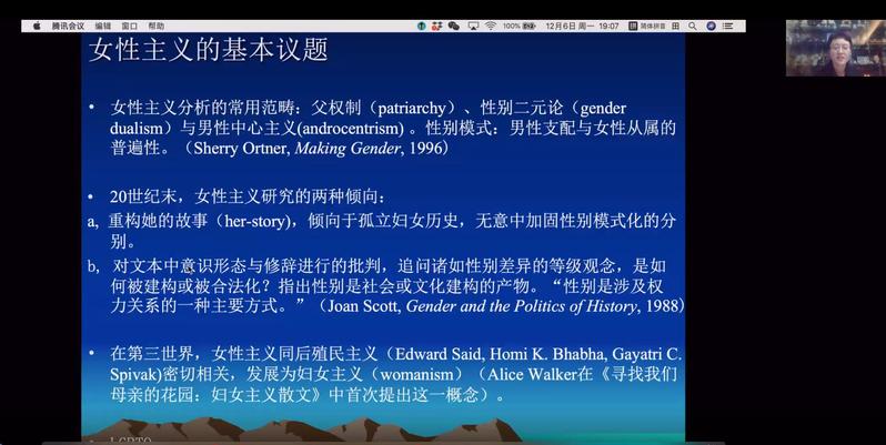 2021年12月6日晚,作为学校百廿校庆学术活动和水果派 “世界哲学日”学术活动之一,四川大学道教与宗教文化研究所田海华教授应邀通过腾讯会议为全校师生作了题为《女性主义批评与经典诠释》的学术报告,哲学水果派 孙玥博士主持报告会。