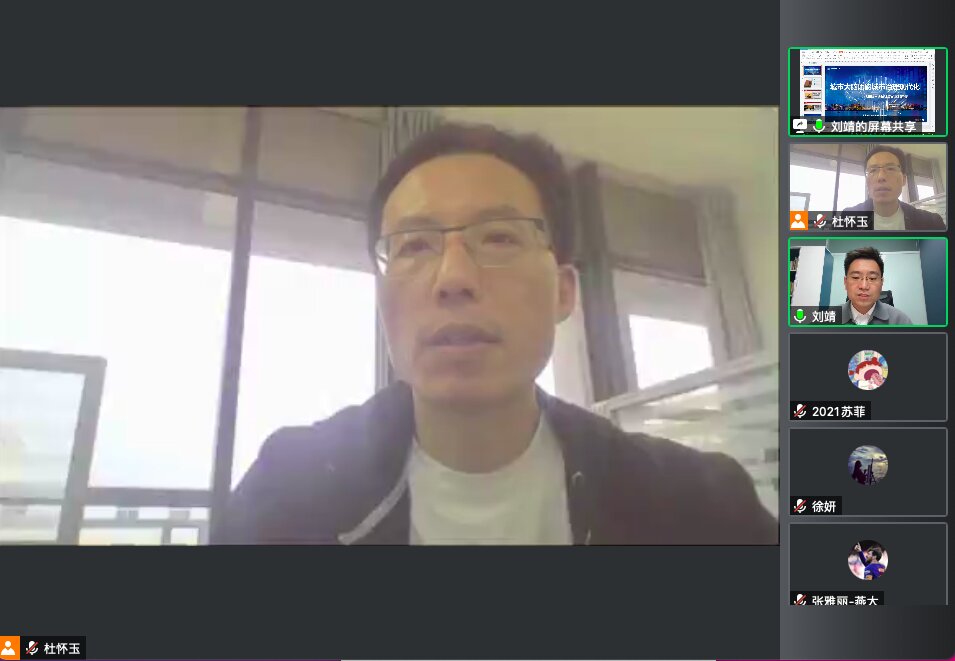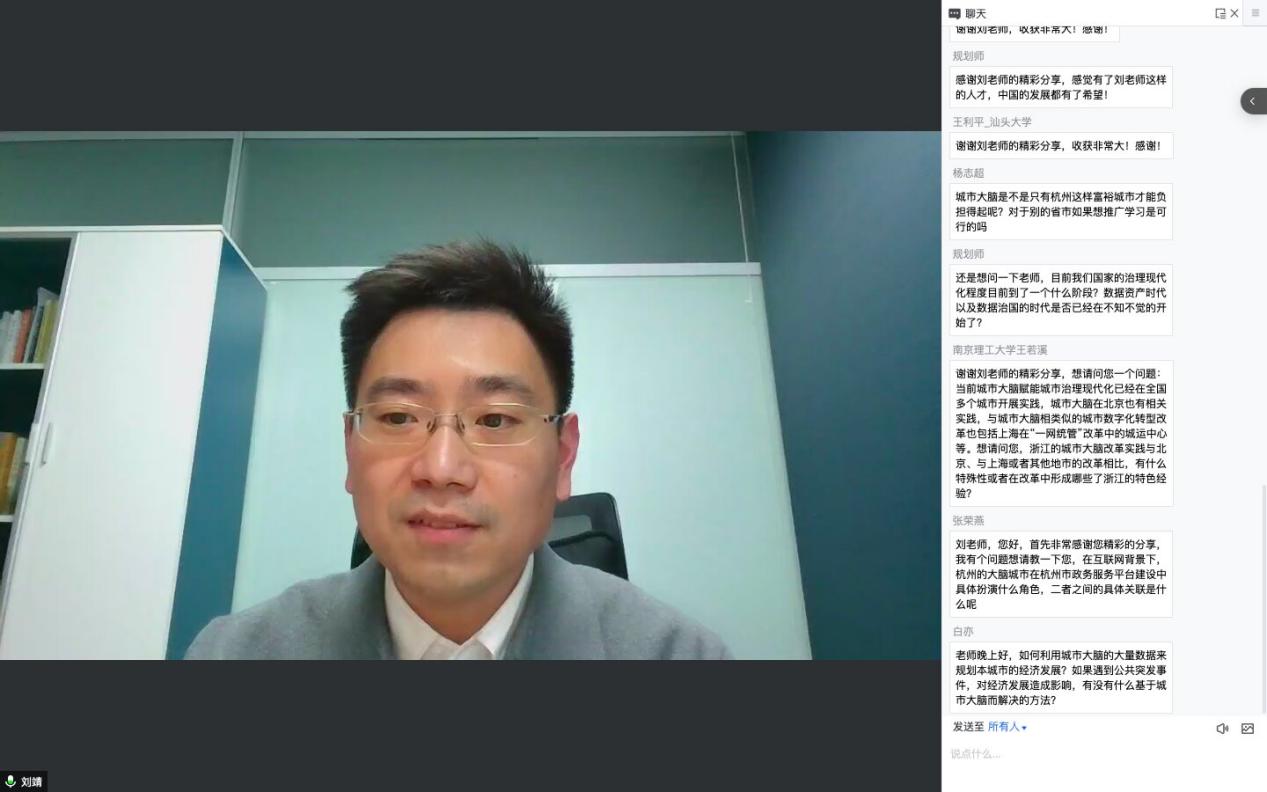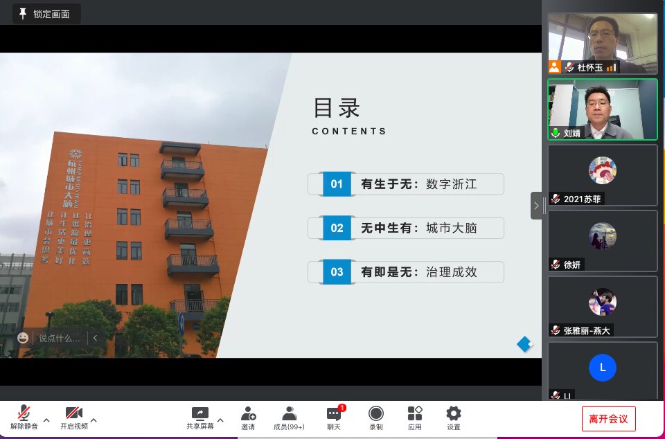 刘靖副教授开展题为“城市大脑赋能城市治理现代化——杭州城市大脑建设实践思考”的线上学术讲座。此次讲座由水果派杜怀玉副教授担任主持人,二百余名校内外师生参加听取了该讲座。