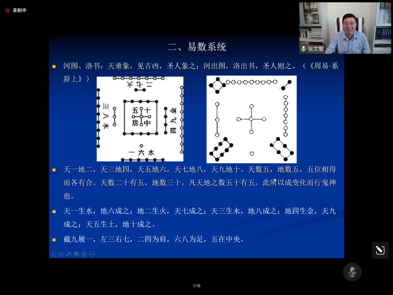 关于易象系统,他主要介绍了乾、坤、坎、离、震、巽、艮、兑八个基本卦象。同时介绍了邵康节《梅花易数》的观梅占,“月体纳甲”解易等。在易数系统里,张老师通过图例和文本解读进一步介绍了河洛之数,解读了“太一”行九宫变化过程,也介绍了大衍之数以及九六之数等易数内容。