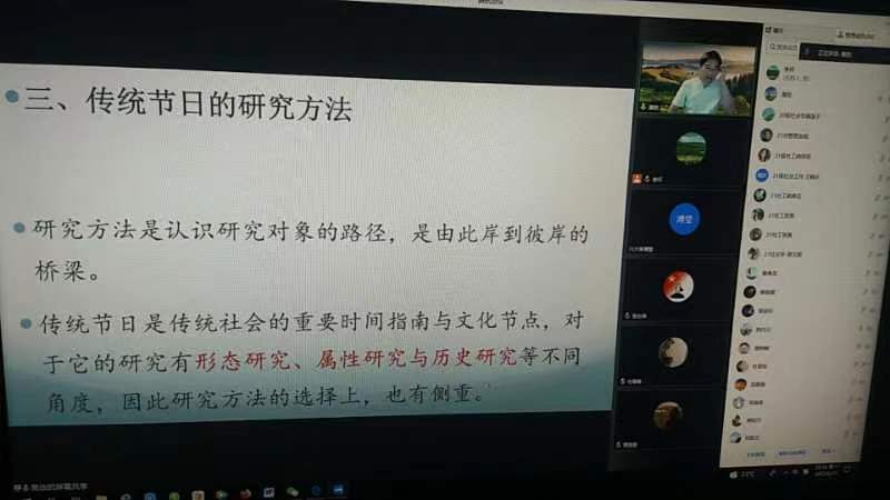 最后,萧老师重点呈现了传统节日的研究方法。他指出,对传统节日的研究有形态研究、属性研究与历史研究等不同角度,因为研究视角不同,因而在研究方法的选择上也各有侧重。形态研究可以从内部形态结构和外部形态两个视角出发,需要使用结构分析法与文化分析法;属性研究需要对其文化属性进行分析研究,采用的是文化分析法;历史研究则主要使用文献研究法与过程分析法。接下来,萧老师以冬至这个传统节日为例,展示如何从不同角度出发对冬至节进行科学研究。在这个过程中,萧老师不仅使用丰富的历史文献资料作引证,而且分享了许多相关的民间饮食与习俗传说,为讲座更增添了一份趣味。