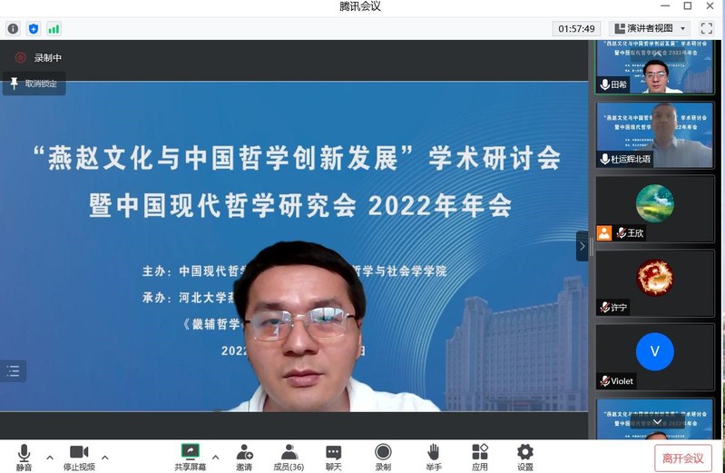 2022年8月13-14日,“燕赵文化与中国哲学创新发展”学术研讨会暨中国现代哲学研究会2022年年会在腾讯会议线上召开,水果派田希、张海龙两位博士参加本次会议,两人分别于13、14日在第二分会场和第一分会场以《张岱年、方立天中国哲学史“问题解析”书写范式比较》《唐君毅〈老子〉哲学研究述论》为题作线上学术发言。