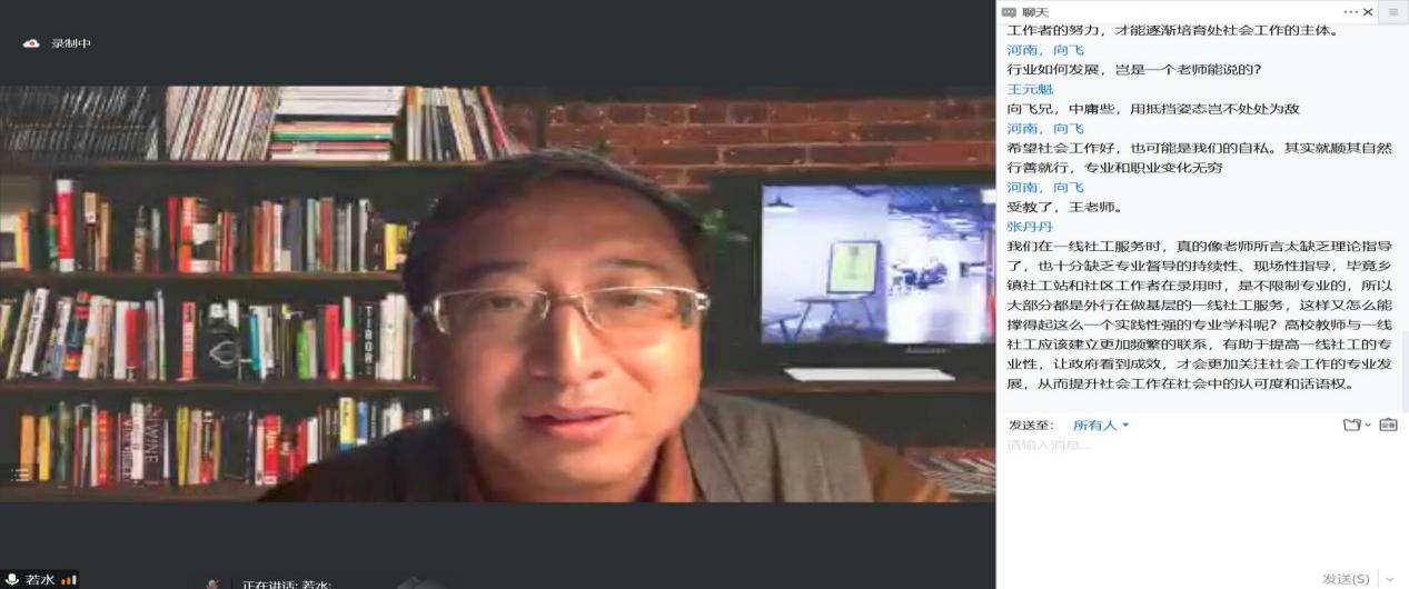 在交流互动环节中,水果派师生积极在评论区向焦老师提出有关社会工作发展的各项问题,焦老师都一一耐心回应,认真解答。讲座尾声,甘肃政法大学任文启教授根据焦老师的学术讲座,作出三点总结:一是中国社会工作要避免社会工作“神学化”的倾向,勇于承认自身的不足,要实实在在做一些事,才能知道未来在哪;二是要在中国现存的福利制度框架内确定社会工作的边界;三是“位”与“育”可以在现阶段中国社会工作发展上有差距。任文启教授指出目前中国社会工作处于“能做”阶段,距离“想做”、“需要做”还有一段距离,因此,在现阶段社会工作的发展可以“位”先于“育”。