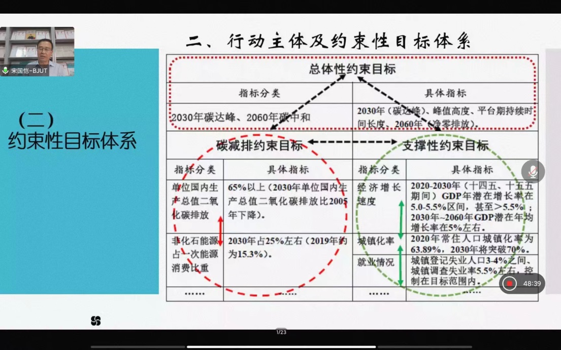 第二个部分,宋老师主要讲解双碳目标的行动主体以及约束性目标体系,具体内容从以下三个方面展开。一是落实“双碳”目标的行动主体,从社会学研究对社会行动的界定中进一步表明了“双碳”目标所涉及的行动主体多元且复杂,分别介绍了政府类碳减排主体:中央政府和地方政府;市场类碳减排主体:各类企业;社会类碳减排主体:社会成员及各类社会组织以及碳达峰碳中和的重点领域。二是约束性目标体系,主要从总体性约束目标、碳减排约束目标和支撑性约束目标三个方面展开讲解。三是实现“双碳”目标的挑战,列举了碳减排国内与国外两个大局下政府的挑战、能源革命和碳减排下重点行业的挑战、社会成员观念与行动的结构性挑战。