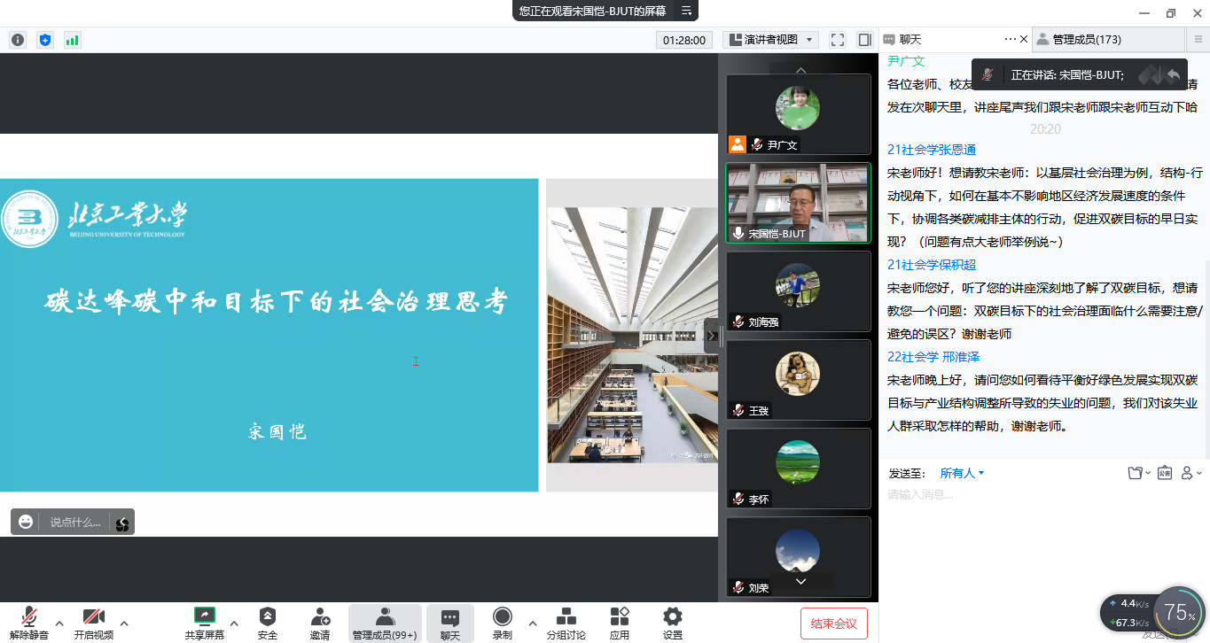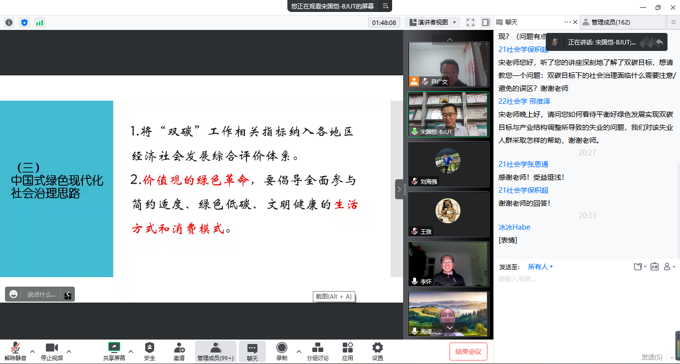 在交流互动环节中,水果派师生与宋老师关于双碳目标下的社会治理问题进行了讨论与交流。宋老师对同学们所提的问题做了一一解答。讲座尾声,孙特生教授对本次讲座做了总结和分享:第一,双碳问题既有现实发展的急迫性又有理论研究的综合性,需要我们从不同视角进行全方位审视;第二,要积极稳妥推进碳达峰碳中和,走绿色发展、人与自然和谐共生的中国式现代化道路;第三,青年人尤其是在校大学生是低碳环保和绿色生活的主要践行者,要加强理念引导和生活行为的践行实践。