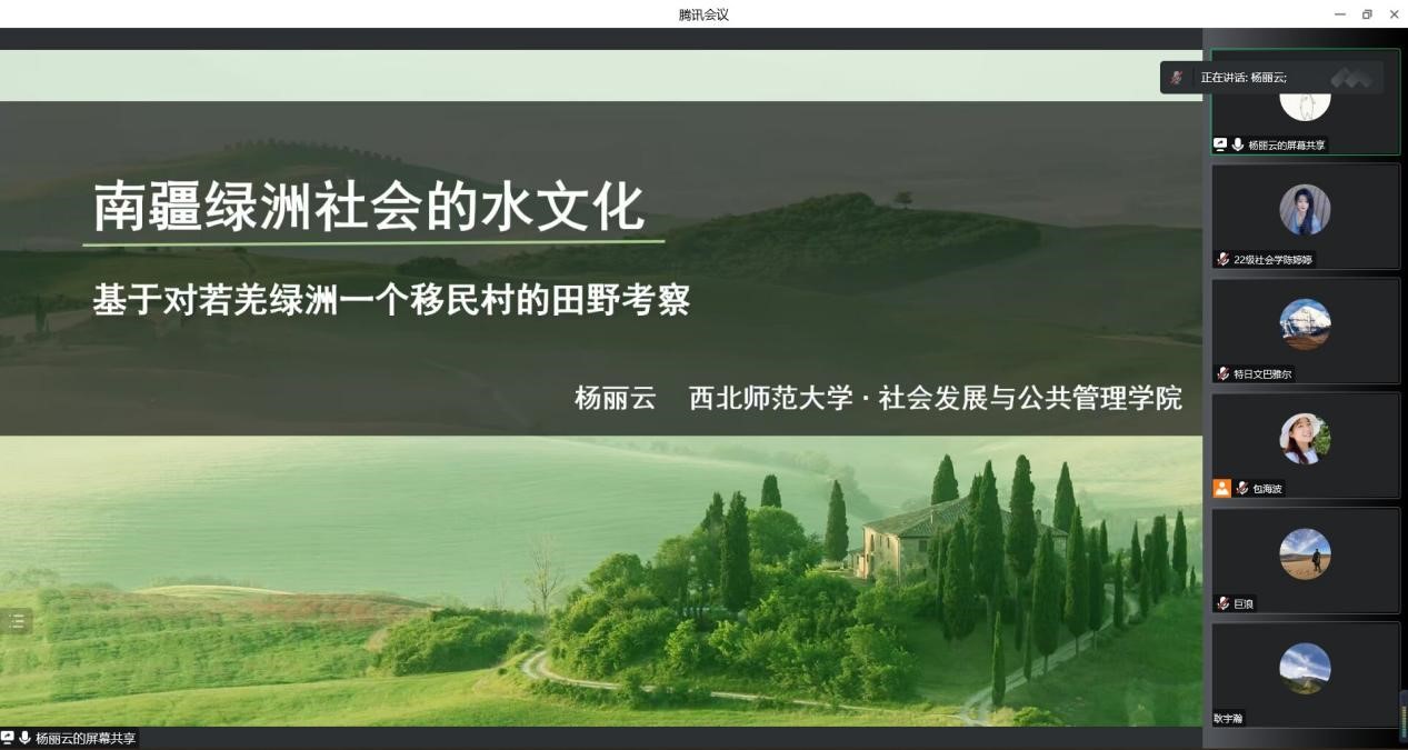 讲座第二阶段,杨丽云老师作了题为“南疆绿洲社会的水文化——基于对若羌绿洲一个移民村的田野考察”的讲座。与一般以“土”为切入点研究农村社会关系网络的研究不同,杨丽文老师另辟蹊径,选择以“水”作为研究点,通过自身田野调查收集到的信息,以此来探究在绿洲自然环境下,“水”对绿洲社会关系网络的影响。杨老师先介绍了一下若羌县的社会地理状况和库尔村(即移民村)以地缘为基础而聚集在一起的人口结构特点。第二部分介绍了库尔村因“水”而形成的特色合作机制。杨老师指出库尔村受制于自然环境的恶劣条件,地表水严重缺乏,为了改变人畜吃水紧张情况,库尔村人民合力共同修建水利设施,村民之间也会另打井水以满足额外用水需求,由此形成了当地以“水”为连接纽带的社会关系网络和颇具特色的合作机制。最后杨老师通过自己的田野调查得出结论:“水”不仅是生存资源,它还可以成为一种文化象征符号。“水”在库尔村不仅促进了各村落合作再生产,也促进了村落共同体的建设,“水”已经成为连接各主体之间的符号和标志。