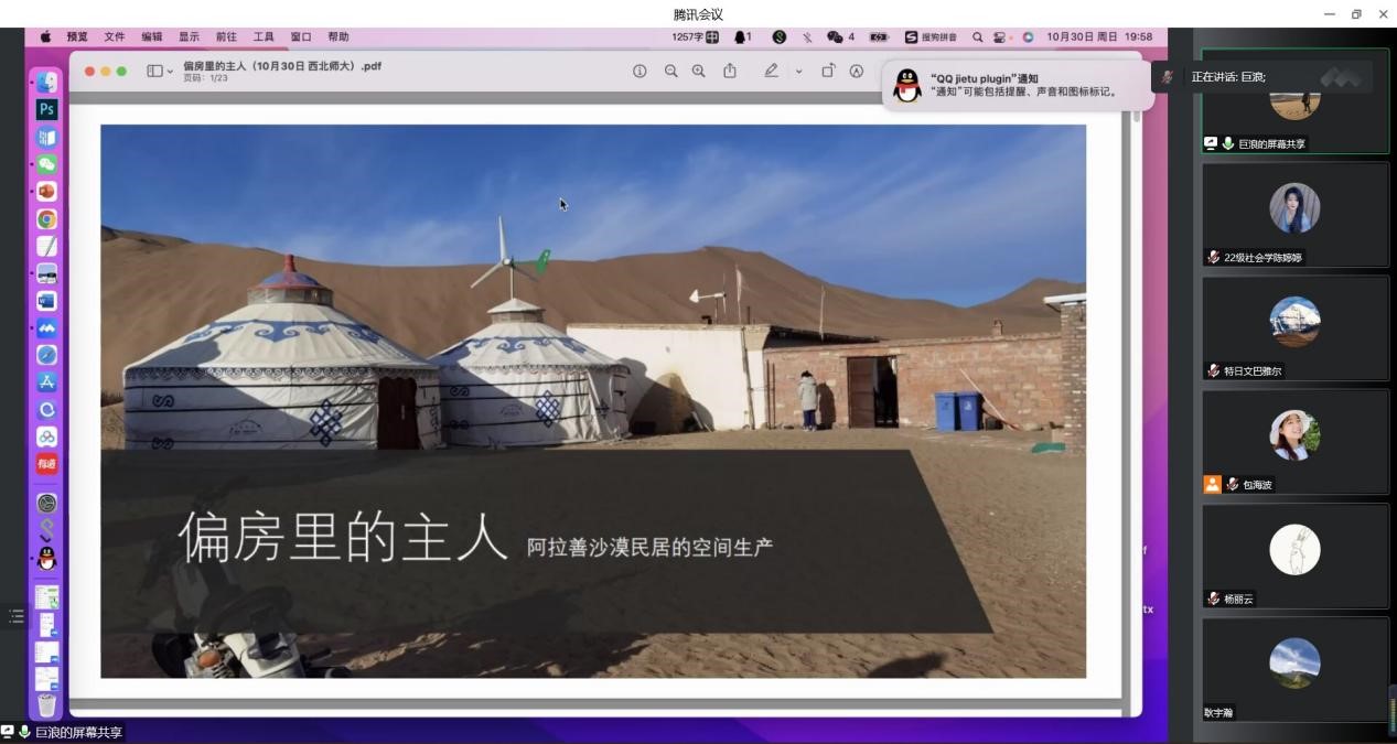 讲座第三阶段,巨浪老师作了题为“偏房里的主人,阿拉善沙漠居民的空间生产”的讲座,从微观角度向我们揭示了阿拉善沙漠地区居民居住空间所承载的宏观社会结构转型的文化象征。巨老师先介阿拉善地点的具体地理情况。接着巨老师为我们解释了自己的观察结果。巨老师通过观察房屋空间建造位置,发现当地房屋建造呈“螺壳式”特征,表现在空间上则是牧民居住的地方逐渐从正房“转移”到偏房。巨老师分析此现象的产生是由于当地人们的空间观念具有模糊性的特点,因此并不严格地区分正门、偏门,只是在房子旁边再建造一座房子,由此呈现出一种“偏移”的假象。另外,巨老师还发现牧场不再承担生活功能,呈现出生产与生活分离的特点。巨老师解释到这是由于在从牧民到市民的现代化过程中,牧民逐渐将生活重心转移到城镇导致的现象。