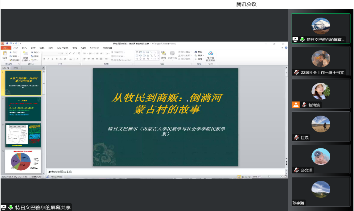 讲座第一阶段,特日文巴雅尔老师作了题为“从牧民到商贩——倒淌河蒙古村的故事”的讲座。讲座以牧民生计变迁为切入口展开叙述,通过列举蒙古村耗牛商贩的贩卖耗牛的例子,说明蒙古村从传统牧业生计转到牧商混合生计的变迁,且牧民转为牧商的身份转变也影响了当地社会关系网络的再建构,由此巴雅尔老师得出生计方式的改变对空间社会关系的改变具有一定程度的决定性影响的结论,生动地为我们呈现了蒙古村社会世界变迁的动态画面。