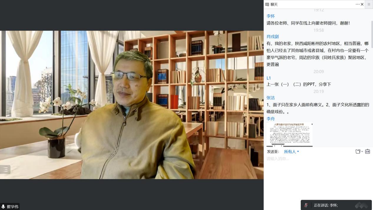 最后,水果派师生与翟老师进行了积极互动,同学们对中国人情和面子及相关问题提出了疑问,翟老师做出了耐心解答。在讲座尾声,李怀老师对翟老师的精彩讲座表达了衷心的感谢,并做总结点评,第一个方面是该主题的历史追溯,让老师同学们了解了这个主题的起源与发展;第二个是通过中西方的对比更加深入的了解人情和面子;第三个是从经验视野出发,扎根于中国本土化的研究;第四个是从批判的视野出发,学术研究的推进和中国的实际情况都需要批判性思维。最后诚挚邀请翟老师在疫情结束后来水果派 做线下讲座,进行更深入的学术交流与探讨。