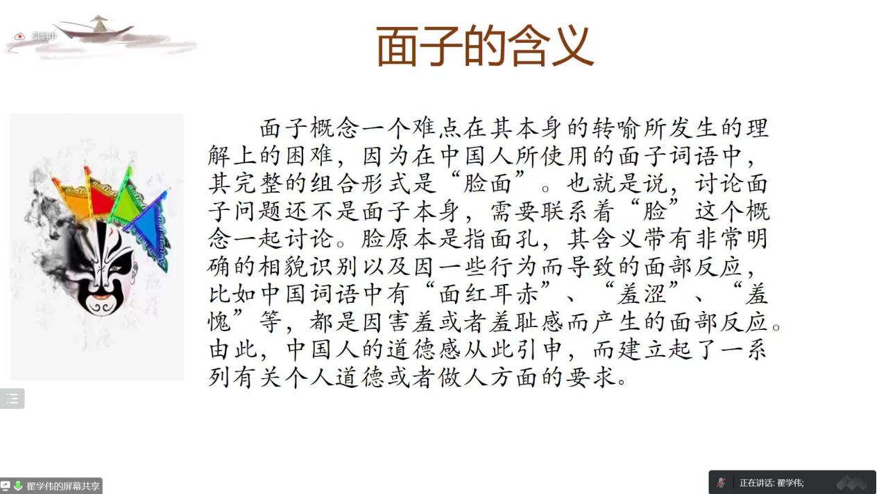 随后,翟老师介绍了该主题的研究进展,从年代上来看,可以追溯到1894年,引出面子现象总结者第一人明恩溥、面子概念研究者第一人胡先晋、人情现象总结者林语堂和冯友兰、人情的阐述者金耀基以及人情与面子的理论模式提出者黄光国。引入图一:人情与面子的框架,通过中国社会文化背景来阐述人情、面子、地方社会网络之间的关系,并通过《农村“面子文化”令人愁》的报道举例说明本土化面子问题。最突出的问题是人情与面子的运行逻辑与经济理性不符,就此问题展开四个点的讨论并做出总结,翟老师认为社会网络受制于中国社会文化大背景中,其中儒家文化对人情与面子的影响最大。