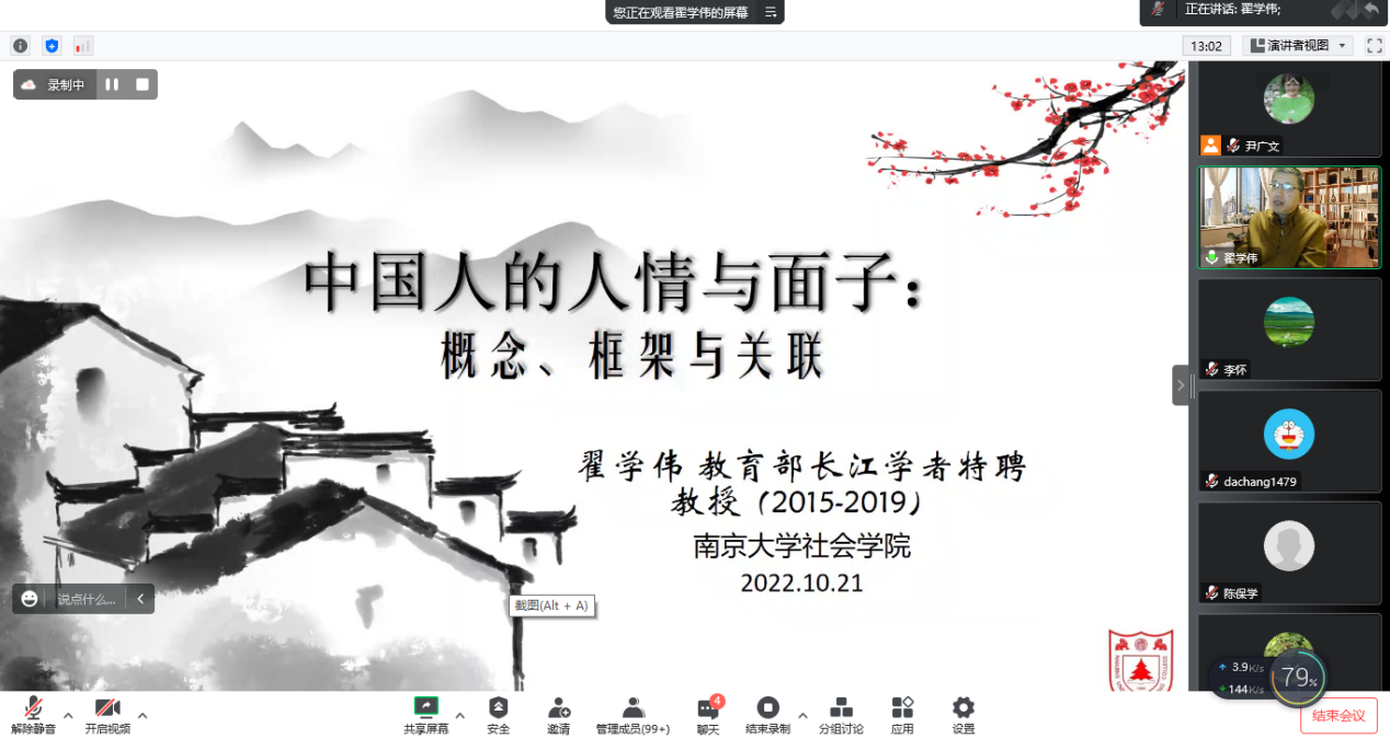 2022年11月4日晚,百廿校庆暨十年院庆系列学术讲座由南京大学社会学系主任翟学伟教授开讲。翟老师为我校师生带来了一场题为“中国人的人情与面子”的学术讲座。此次讲座由李怀教授主持,近三百名校内外师生参加该讲座。