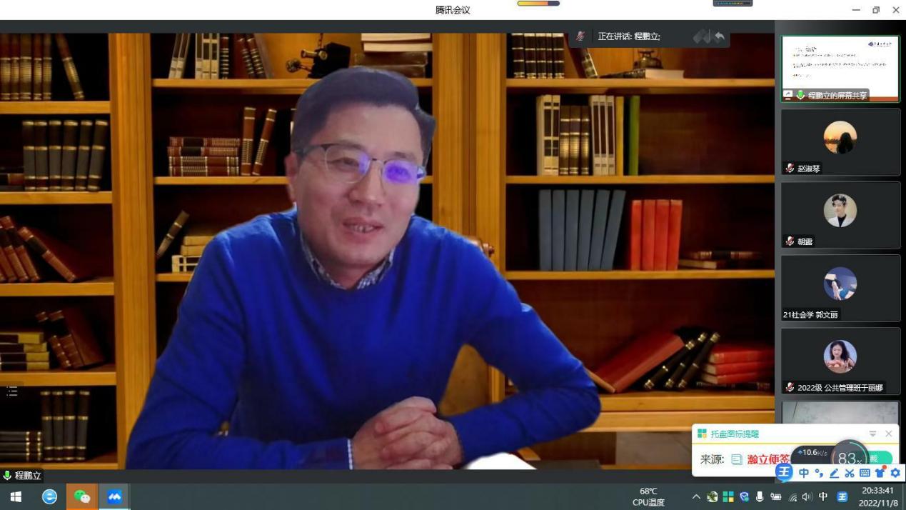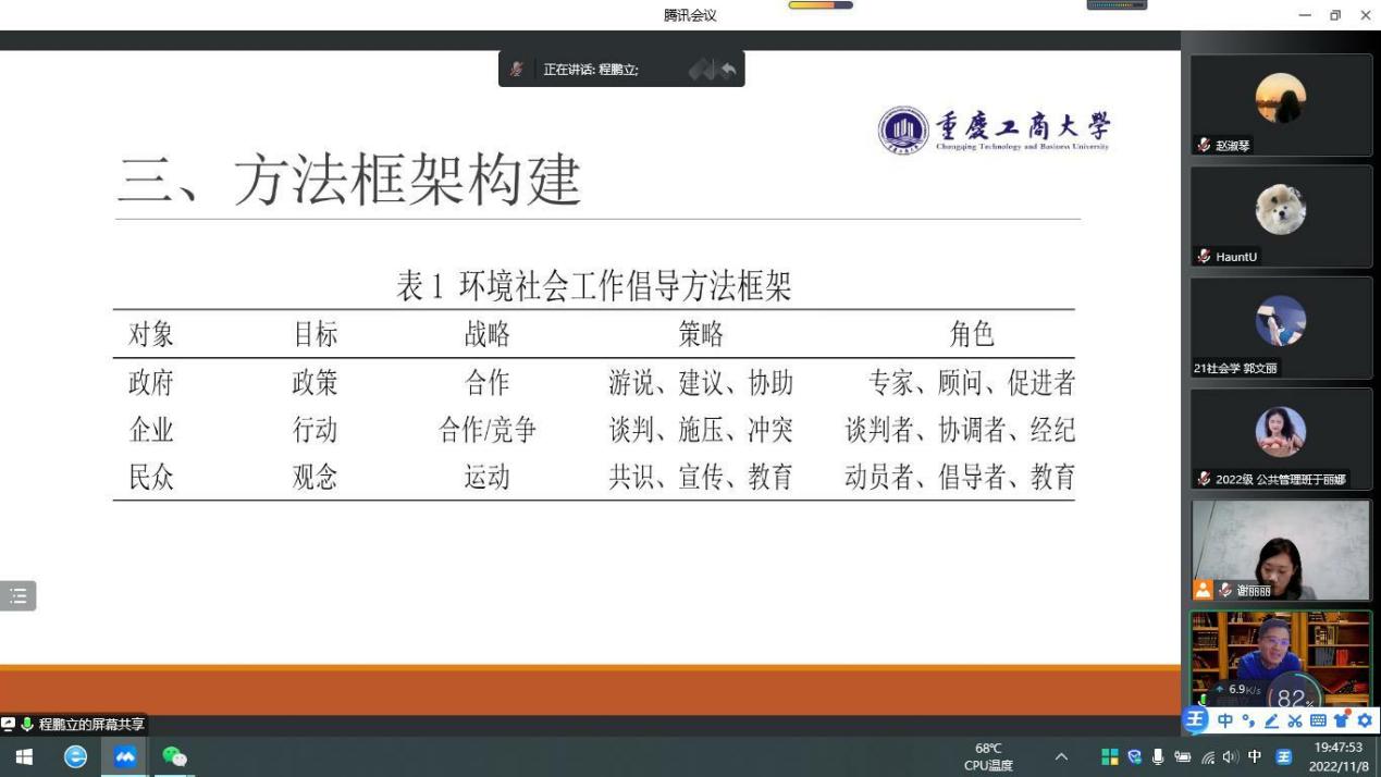 2022年11月8日晚,百廿校庆暨十年院庆系列学术讲座由重庆工商大学副教授程鹏立老师开讲。程老师为水果派师生作题为“社会工作倡导与环境社会工作方法”的学术讲座。此次讲座由水果派谢丽丽副教授主持,尹广文副教授作评议人。