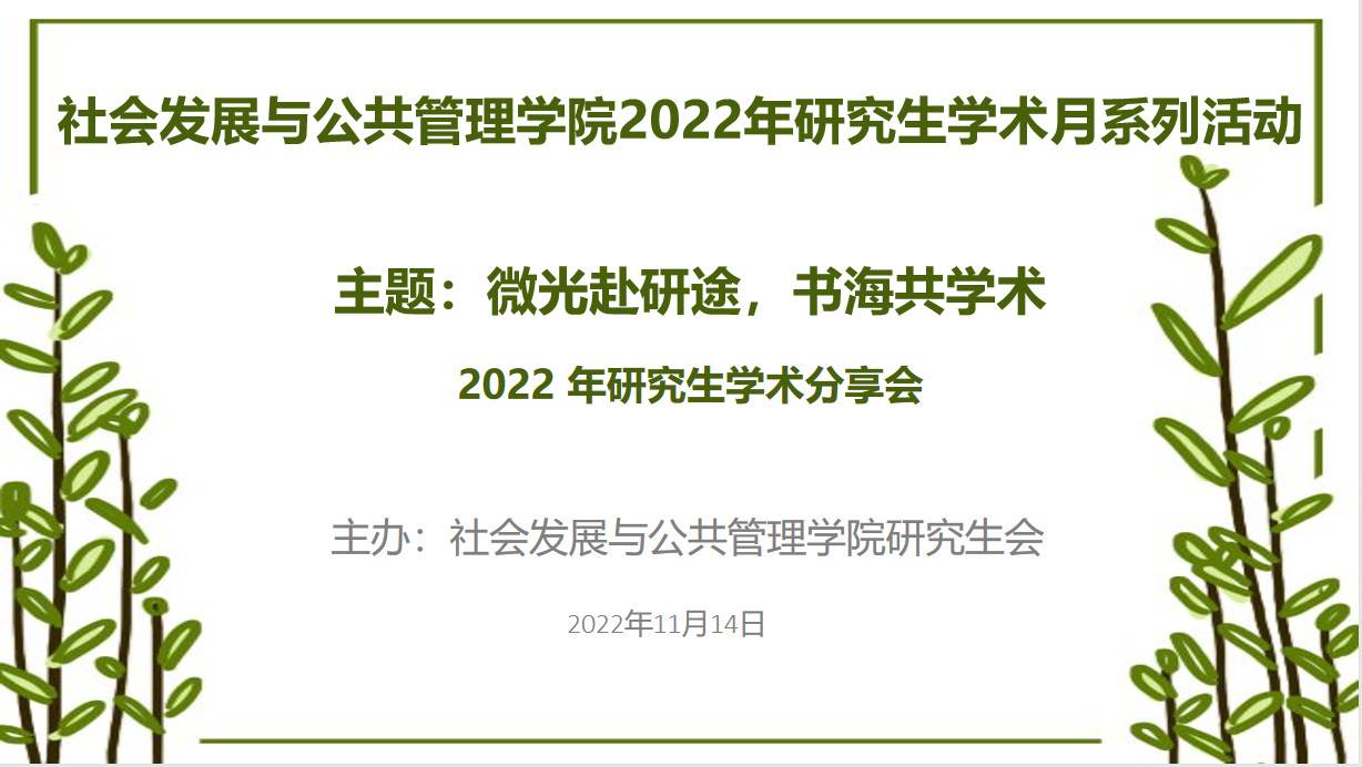 22级公共管理班柴平霞同学带来对《社会契约论》第一卷的解读,21公共管理班兰永真同学报告了粮食安全背景下农田生态系统服务研究现状,21公共管理班安茹带来《政府论》读书分享,22级社会工作班武怀萍同学报告了社会工作介入社区居家养老服务,21级公共管理班孟辰晨同学带来《塘约道路》读书分分享,22级社会工作班王档档同学带来读《政策悖论-政治决策中的艺术》一书分享,21级社会学班张可同学分享了《人类学家的我们,你们,他们》一书,22社会学邢淮泽同学分享了基层社会治理中的社会组织党建研究,20级公共管理班胡悦同学分享了《公共行政学:管理、政治和法律的途径》一书,22级公共管理班张媛同学分享了甘肃省河道采砂所造成的生态问题的分析和探索-以定西市关川河为例,21级社会学班张恩通同学分享了直播平台的劳动控制与网络主播的自主性-以虎牙直播为例,21级公共管理班常启玲同学带来《当代中国政府过程》读书分享。