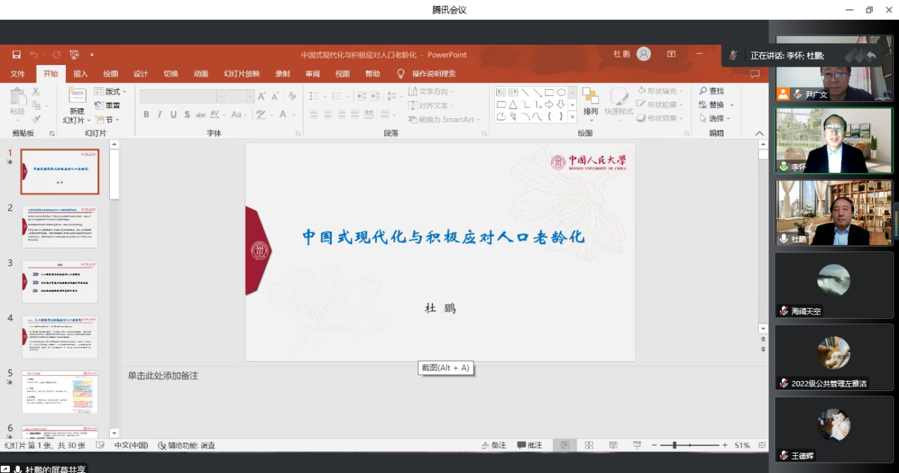 2022年11月19日19时,百廿校庆暨十年院庆系列学术讲座由中国人民大学副校长杜鹏教授开讲。杜老师为我校师生带来了一场题为“中国式现代化与积极应对人口老龄化”的学术讲座。此次讲座由李怀教授主持,近三百名校内外师生参加该讲座。