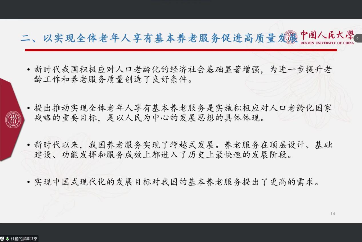 其次,杜老师指出要以实现全体老年人享有基本养老服务促进高质量发展为目标,积极应对人口老龄化中国道路的基础是日益夯实的社会财富,最大优势是党的领导,根本原则是以人民为中心,要及时了解基本养老服务需求量,全面加强组织保障和人才支持;同时要创新基本养老服务形式与内容,加强基层党组织建设,推动养老服务下沉。农村是实施积极应对人口老龄化国家战略的关键,推动实现全体老年人享有基本养老服务的重点,让老年人老有所养、病有所医、老有所为。将实施积极应对人口老龄化国家战略与乡村振兴等国家战略协同发力,才能加快补齐农村养老服务的短板。