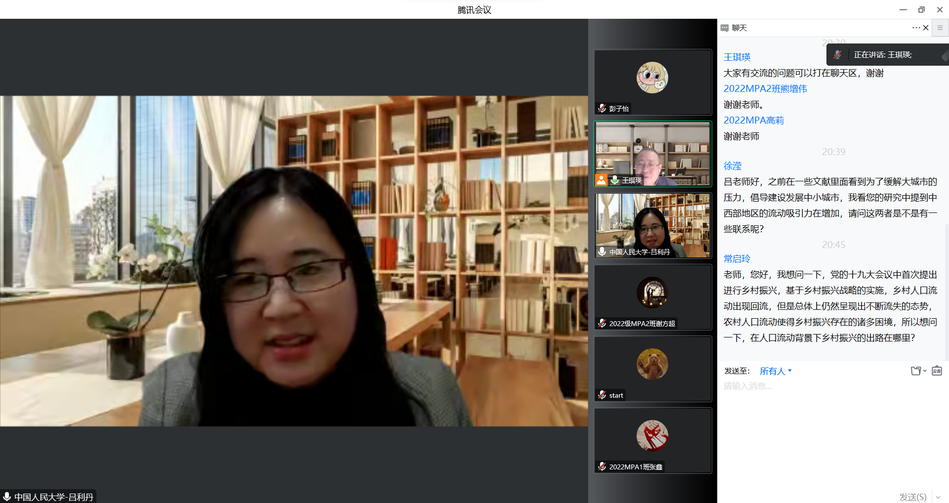 最后,王老师分享了自己的学习心得。吕老师的讲座体现了三个研究逻辑。(1)历史的逻辑:吕老师详细讲述了从古代中国到新中国成立后的人口流动史,为研究流动问题提供了宽广的视野;(2)现实的逻辑:研究从现实问题出发,从“七普”数据中分析得出我国高流动性的特征;(3)理论的逻辑:对人口转变理论的解读与批判。