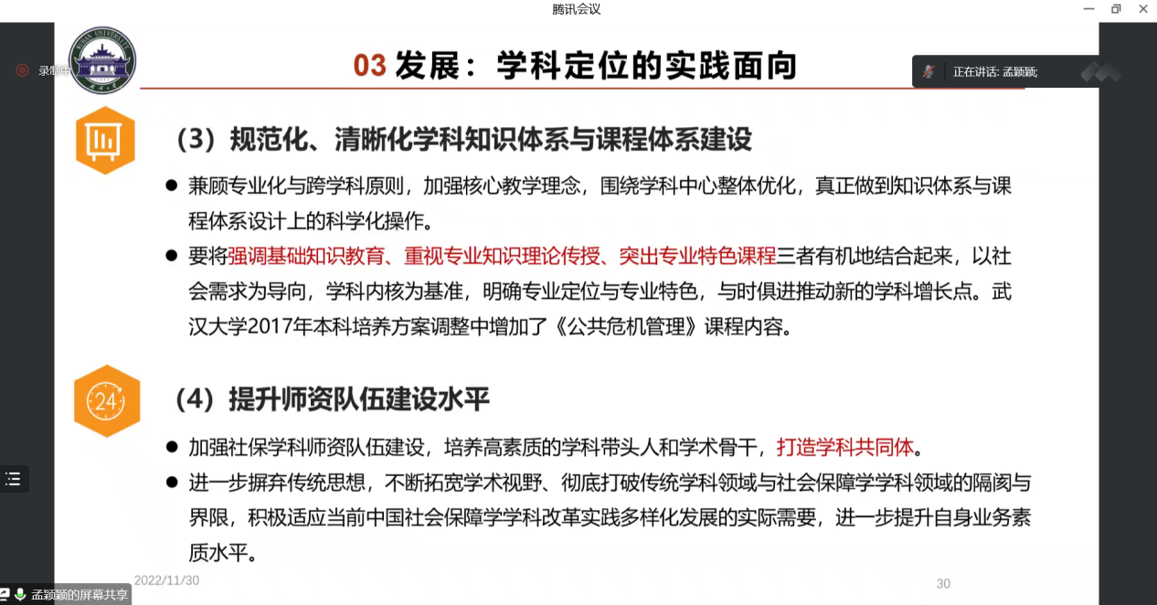 2022年11月30日19时,武汉大学孟颖颖教授应邀为水果派师生在线上作了题为“发展中的中国社会保障学: 挑战、定位与未来——基于学科发展的思考”的学术讲座。本次讲座由水果派王琪瑛老师主持,水果派 共计200多名师生参加。