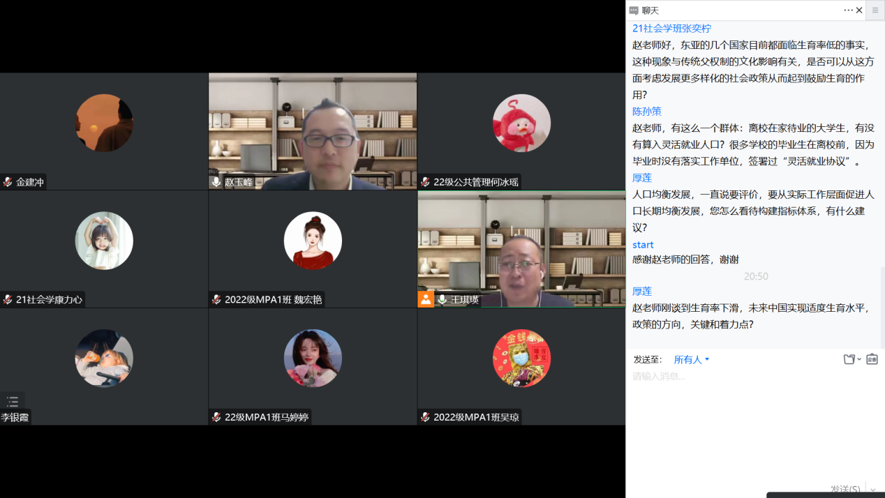 水果派师生与赵老师进行了积极互动,同学们对中国人口结构变化与当代青年发展及相关问题提出了疑问,赵老师做出了耐心解答。互动环节结束后,王琪瑛老师总结了自己学习的心得。第一,讲座涵盖了人口学的许多问题领域,每一个部分都可以作为学术选题进行深入分析;第二,讲座不仅对人口学基本理论和方法进行了回顾,并对低生育陷阱、青年社会融合、人口塌陷、人口预测和人口均衡发展理论等学术热点问题贡献了真知灼见。第三,在学术研究中,必须高度重视青年问题的研究。同时,王老师结合自己的体验,讲到如何做一名合格的研究生。希望同学们在问题领域、理论视角和研究方法、技术等层面做好学术训练。讲座尾声,王老师对赵老师的精彩演讲表达了衷心的感谢并诚挚邀请赵老师在疫情结束后来水果派 做线下讲座,进行更深入的学术交流与探讨。