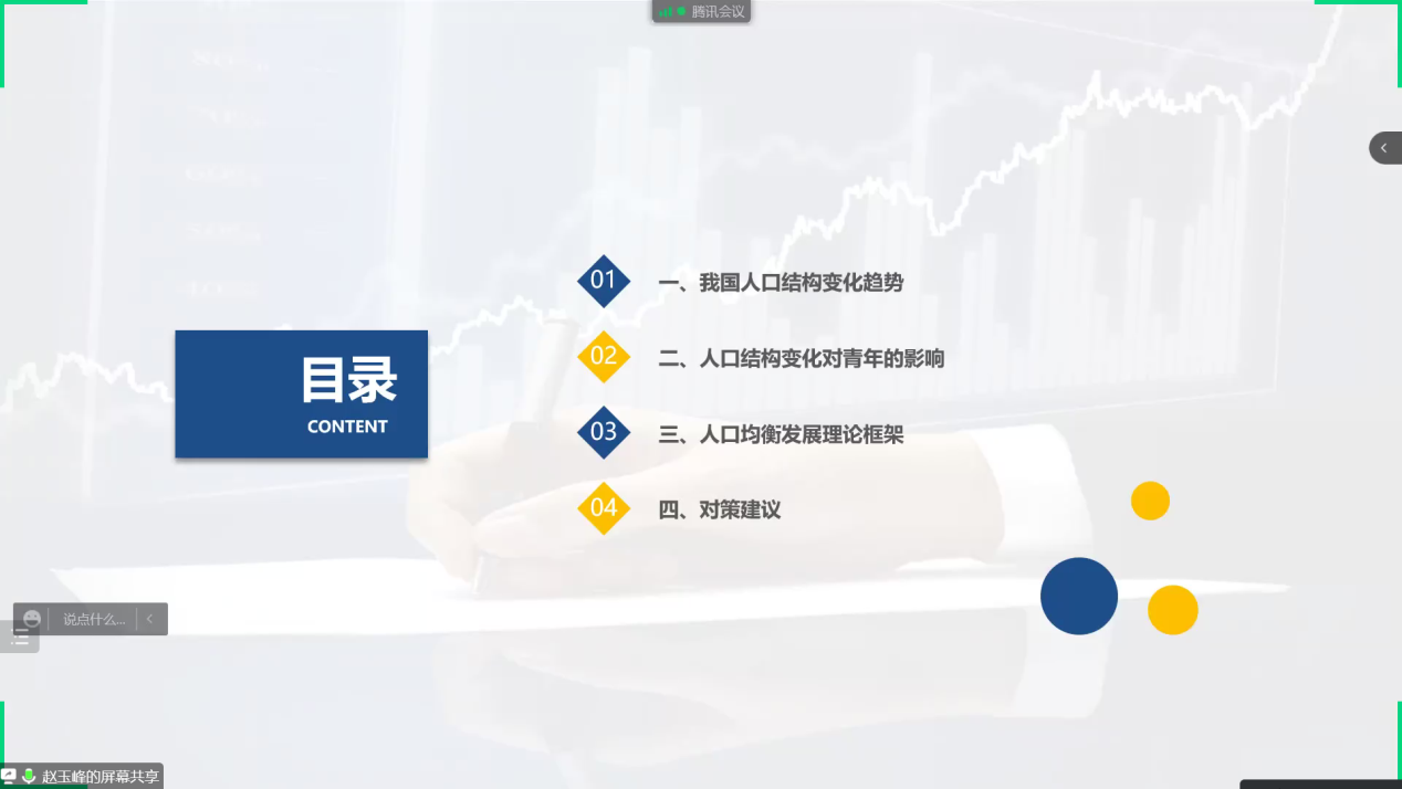 第四部分是人口均衡发展理论对青年问题的指导意义,赵老师从以下四个方面进行了论述:第一个方面是该理论促进青年人口总量保持在适度水平,一是落实生育配套政策,推动未来青年人口保持适度规模,构建生育友好型社会政策体系,建立成本分摊机制和税收抵扣减免机制,加快推进托育服务体系建设;二是重点研究、统筹部署、系统推进人口发展战略,发挥政策对保持青年适度人口规模的效能。第二个方面是该理论推动青年人口素质整体全面提升,一是加快推动基础教育和高等教育发展,提高青年人力资本素质;二是构建长远的人才培养机制,发挥青年建设现代化的作用;三是提高青年健康素质,推进人力资本高素质发展。第三个方面是该理论营造青年友好的创新活力型社会环境,一是培育经济新动能、产业新业态、人才新就业等未来模式,为青年就业提供良性社会环境;二是改革完善多元人才评价指标体系,多渠道建立青年人长期发展信心。第四个方面是该理论优化青年人口布局服务国家重大战略,一是协调好人口流动与国土空间整合利用的关系,推动区域人口与经济协调发展;二是加大对外来务工人员等群体的服务保障力度;三是通过改善乡村基础设施、人居环境水平,加大产业融合发展;四是加快实施产城融合、生态留白等区域规划和发展模式,推动人口与生态协调发展;五是全方位引进国际优秀人才,创新人力资本全球化配置理念,吸引国际科技、创新、产业和管理人才为我所用。