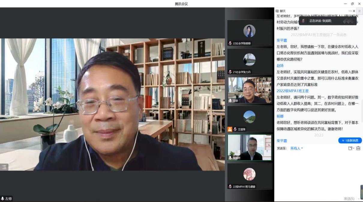 讲座尾声,左停教授与水果派师生进行了热烈地交流与讨论,并针对水果派 师生们提出的问题进行了认真回应。随后,张老师结合自己的观点对左老师此次讲座作了点评。首先,张老师指出随着社会的发展,农村低收入人群的帮扶问题,成为了国家、地方以及各类人群的重要问题。长期的脱贫攻坚之后,我们国家全面建成了小康社会,但是,农村低收入人口的帮扶问题越来越成了全面乡村振兴、实现农业农村现代化和共同富裕等的重大问题中的重中之重。所以,从国家层面上,相近连续出台了一系列的政策,比如:左老师讲的《中共中央国务院关于乡村振兴和脱贫攻坚的有效衔接问题的意见》。2021年10 月,我们国家出台了实现农业农村现代化十四五规划。今年党的二十大,聚焦到共同富裕上,涉及到低收入人口的讲话,针对国家大政方针的落地及见效问题提出了相关规划。然后,张老师指出在农业农村现代化十四五规划里面,第八章第三节主要讲了健全农村低收入人口和欠发达地区的帮扶机制,总共讲了四个方面,提出了要动态监测分类帮扶,集中支持重点帮扶县,对西部地区160个国家乡村振兴重点帮扶县给予集中支持,加强财政转移支付,巩固脱贫攻坚成果和乡村振兴的有效衔接。最后,张老师提出怎么做才能将政策落地?能够对乡村振兴、农业农村现代化到共同富裕有所帮助,这是学者及学子应该认真思考的问题。针对政策怎样落地的问题,张老师指出左老师对低收入人口先做了一个学术的构建,从六个不同的方面,回答了什么是低收入人口。在此基础上,左老师又提出了六个维度的政策选项,针对不同的适用对象提出了创新性的可供选择的政策选项。这样才能真正把乡村振兴、农业农村现代化和共同富裕最难的低收入人口的相关问题精准到位,使得国家下一步的社会救助和反贫困的帮扶政策能够更加科学、合理、准确和具有操作性。张老师指出左老师的讲座精彩丰富,不仅对研究问题具有自己的学术思想和理论探讨,而且左老师对于研究现实热点及难点问题的路径逻辑,值得我们师生共同学习和共同探讨。