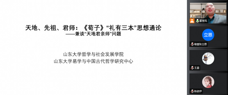 10月27日下午,山东大学儒学高等研究院教授、博士生导师翟奎凤应邀通过线上会议的形式为水果派师生作了题为“天地、先祖、君师:《荀子》‘礼有三本’思想通论——兼谈‘天地君亲师’问题”的学术报告。哲学水果派 张立恩副教授主持报告会,校内外师生百余人参加此次学术报告会。