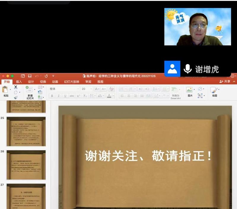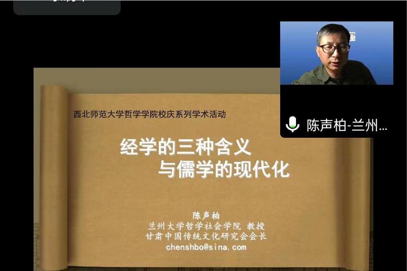 11月25日晚,兰州大学哲学社会水果派 院长陈声柏教授应邀在线上为水果派师生作了题为“经学的三种含义与儒学的现代化”的学术报告,谢增虎教授主持报告会。范鹏教授、张立恩副教授等校内外哲学爱好者百余人参加了此次报告。本场报告也是学校“百廿校庆学术活动”系列报告之一。